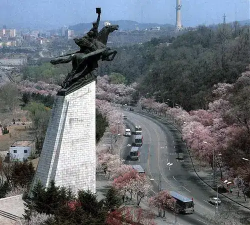 En el billete se ve la estatua del caballo galopante de Chollima. El movimiento Chollima promovía el rápido crecimiento de la economía norcoreana, bajo la guia del eterno líder Kim Il Sung, en vez de guiarse por políticas económicas razonables.