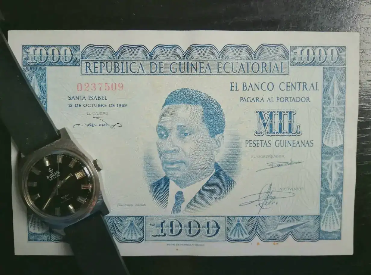 Ostin!!! No había visto nunca alguna así!!!, q maravilla!!!Mil pesetas guineanas de 1969 y reloj Potens de la época. A los menos jóvenes les resultará familiar el diseño del billete. Guinea Ecuatorial se independizó de España en 1968, y los billetes se diseñaron e imprimieron en la FNMT, basándose en los billetes españoles en circulación en ese momento.