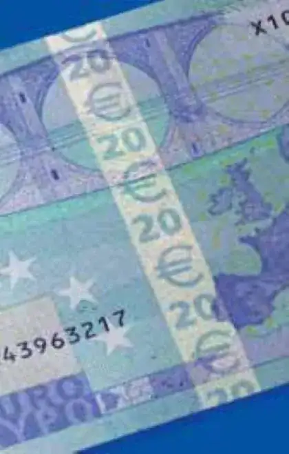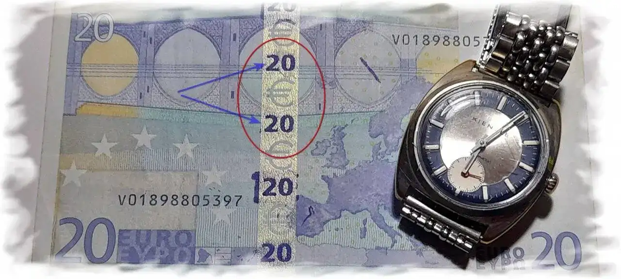 RAREZA. Billete de 20€ con exceso de tinta en la banda irisdicente, como la llama el Banco de España (solo la tienen los billetes de 5, 10 y 20€). Billete de la 1ª Serie, sustituida en la actualidad por la Serie "Europa". Creo recordar que en la 1ª Serie la letra inicial indicaba el banco emisor o el país, no estoy seguro. Ahora consta de dos letras, siendo la 1ª el banco emisor y la segunda a efectos de correlación. Supongo que no todos habrán tenido un "fajo" de billetes nuevos. Bien, pues no están correlativos, van de nueve en nueve. Y ésta es otra curiosidad a añadir a las medidas de seguridad para detectar errores.