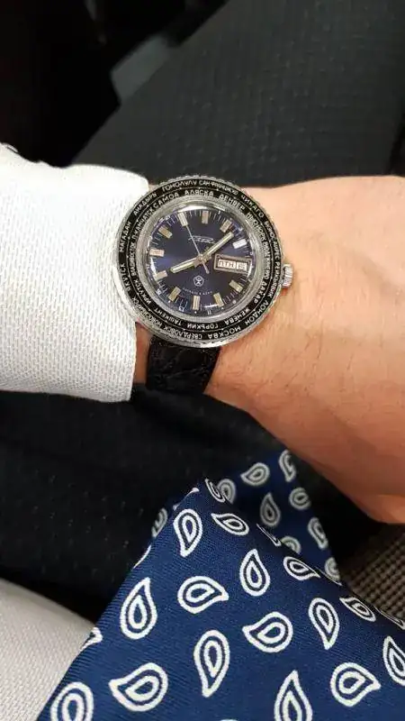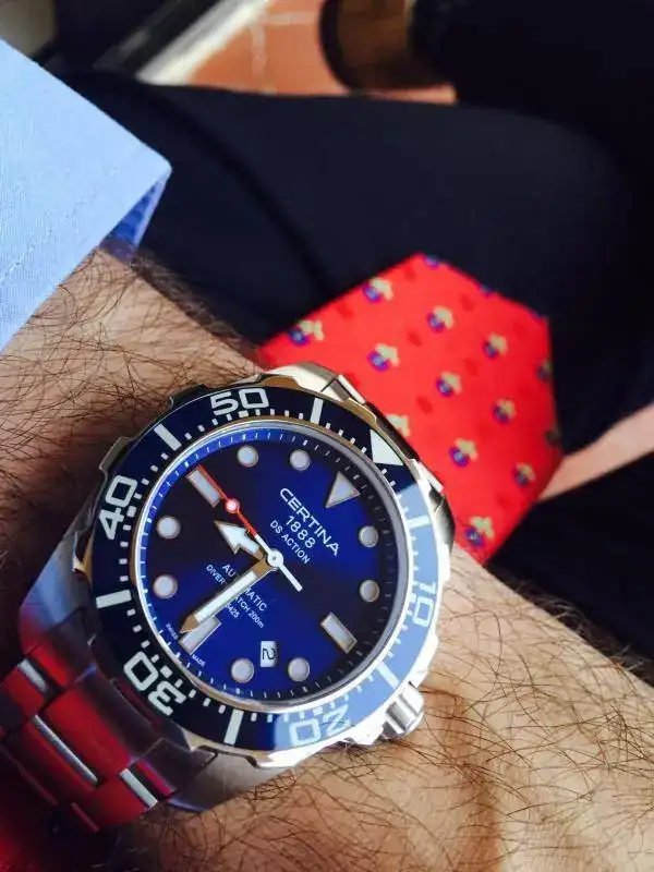 Yo creo que los relojes han de combinar con los puños, ya sea de la camisa, jersey, camiseta o americana. Y la corbata con la camisa. El contraste o combinación lo hace el puño con el reloj.