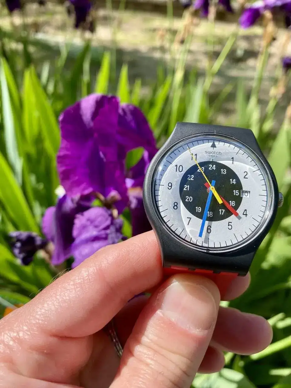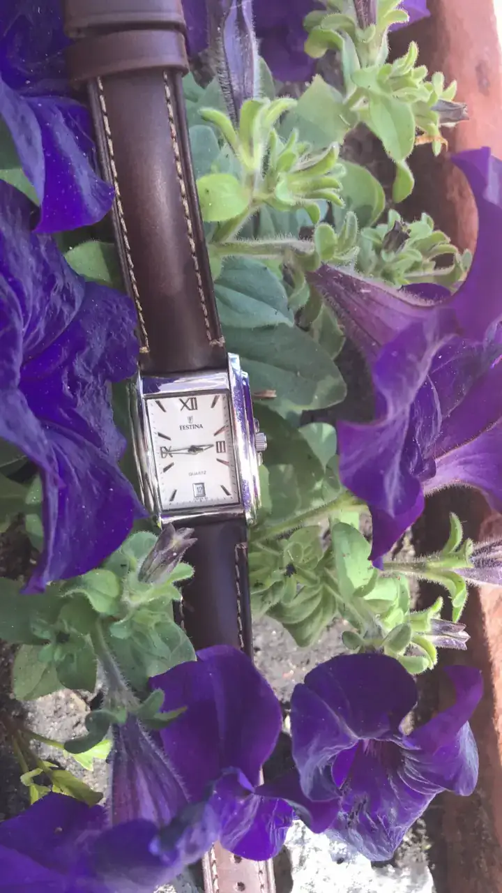 Muy bonitas flores y reloj. Si lo pones a "imagen completa", quedan mas chulas.Viernes en Madrid y después de unos cócteles, no distingo bien entre el púrpura y el morao.