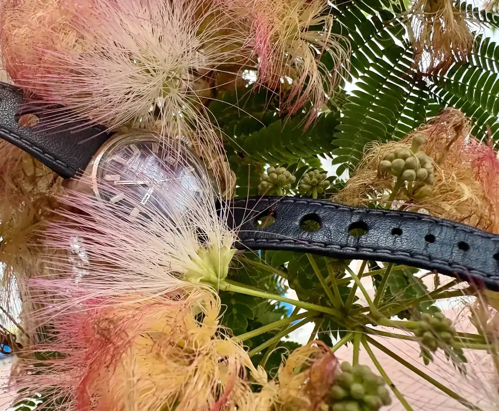 Precioso Tissot que luce fenomenal en las especiales flores de Acacia de constantinoplaYa han florecido también estos vistosos arbolitos