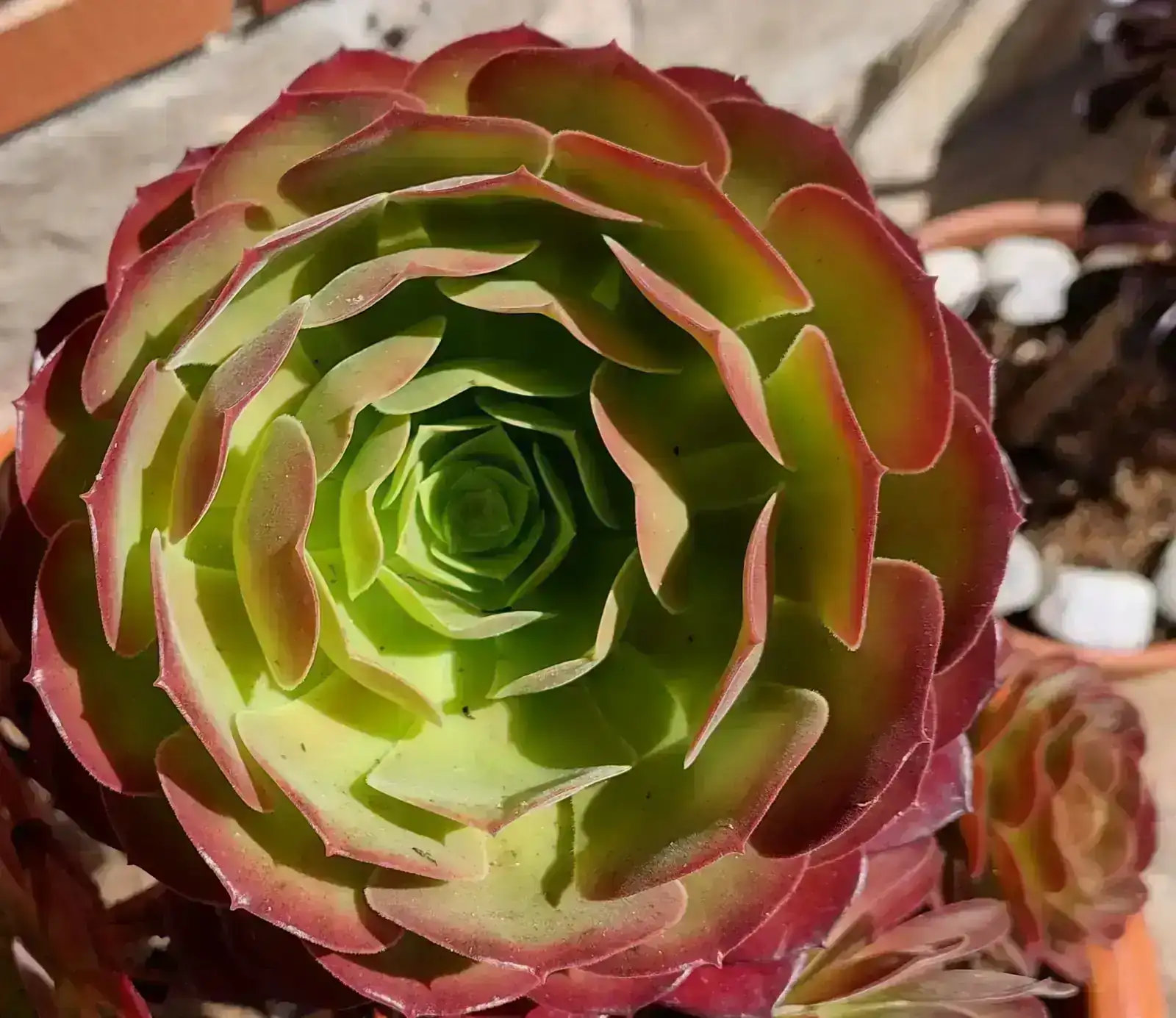 La vistosa y especial planta es Aeonium, me encantanTuve esas verdes y ahora las tengo hibridas ( más rojizas)