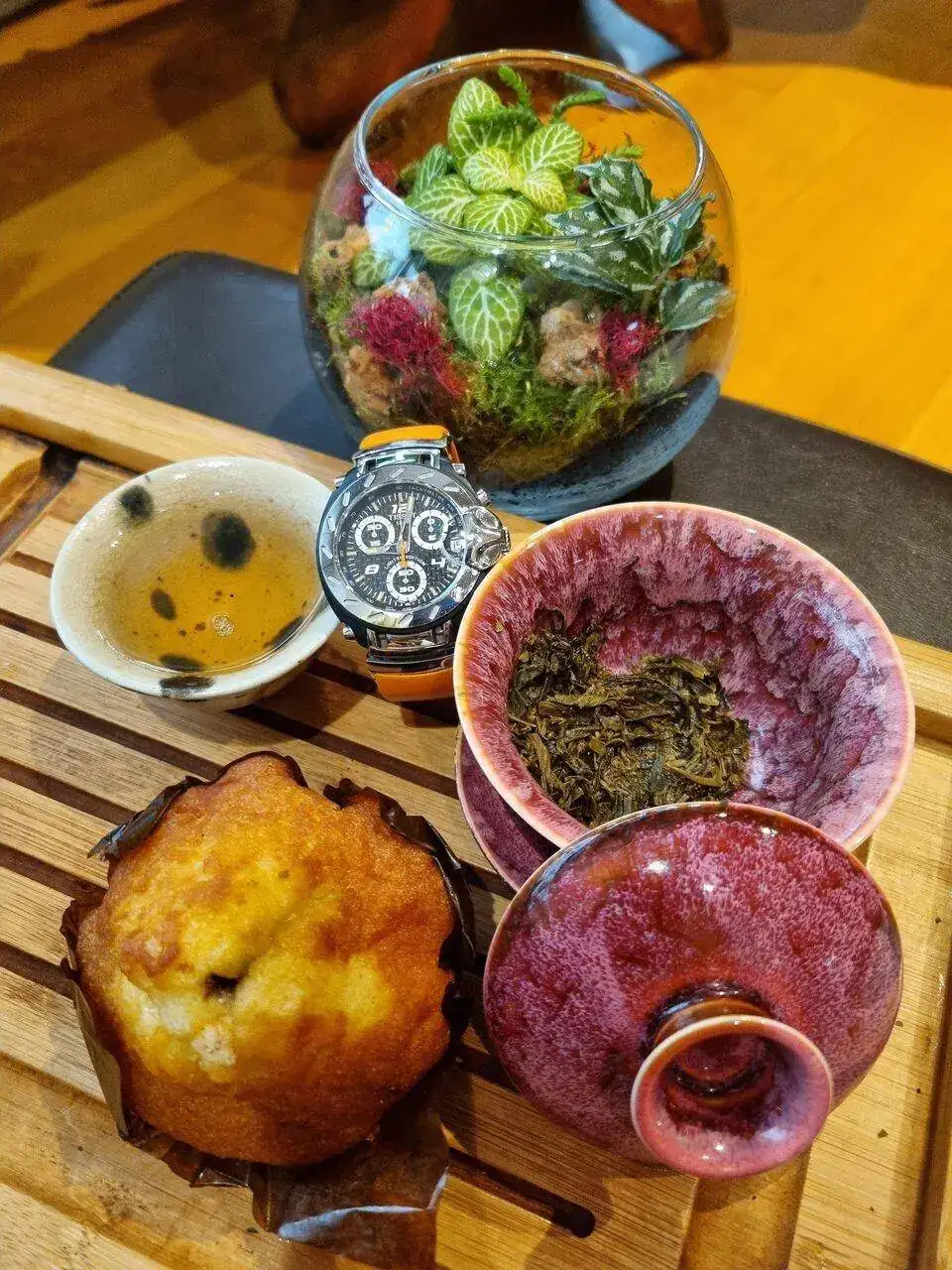 Deliciosos y apetecibles, té y magdalena... preciosos, terrario y reloj, la foto estupenda