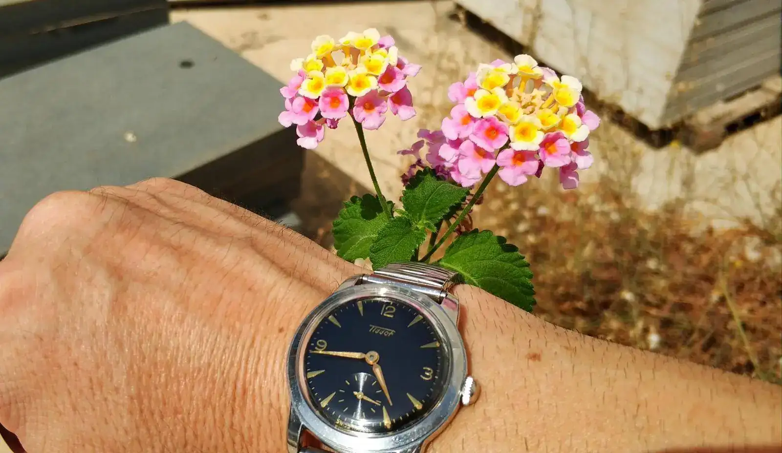 Ayyyy que caló, pudo darle una insolación al precioso negrito [emoji2960][emoji2960][emoji2960][emoji2960]4 de la tarde con 43 grados, a ver cómo justifico un golpe de calor ...." na, estaba haciéndole una foto a un reloj junto a una flor" celador, traiga la camisa de fuerza...