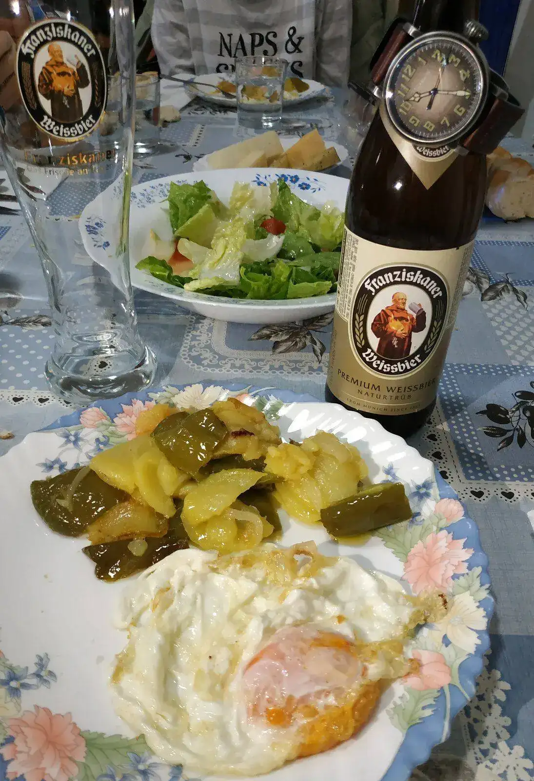 Huevo frito con patatas y pimientos, ensalada de lechuga y tomate y un buena cerveza alemana.
