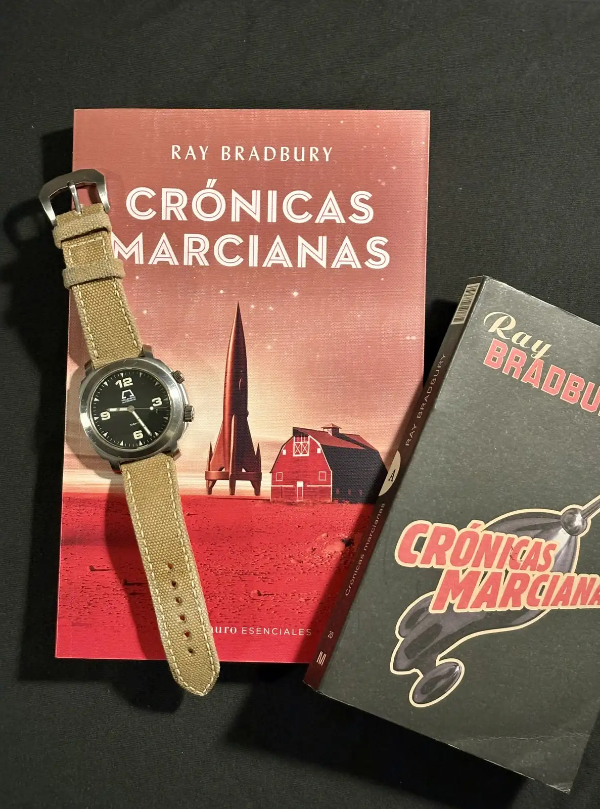 Muy bueno el cuadro, recuerda a cuando los niños están al borde del lago seco (creo que era algo así) y le preguntan a los padres ¿dónde están los marcianos? Uno de mis libros de ciencia ficción favoritos, y el reloj muy chulo.No se si son mis favoritos, pero hoy son en los primeros que he pensado. Millemetri y Ray Bradbury