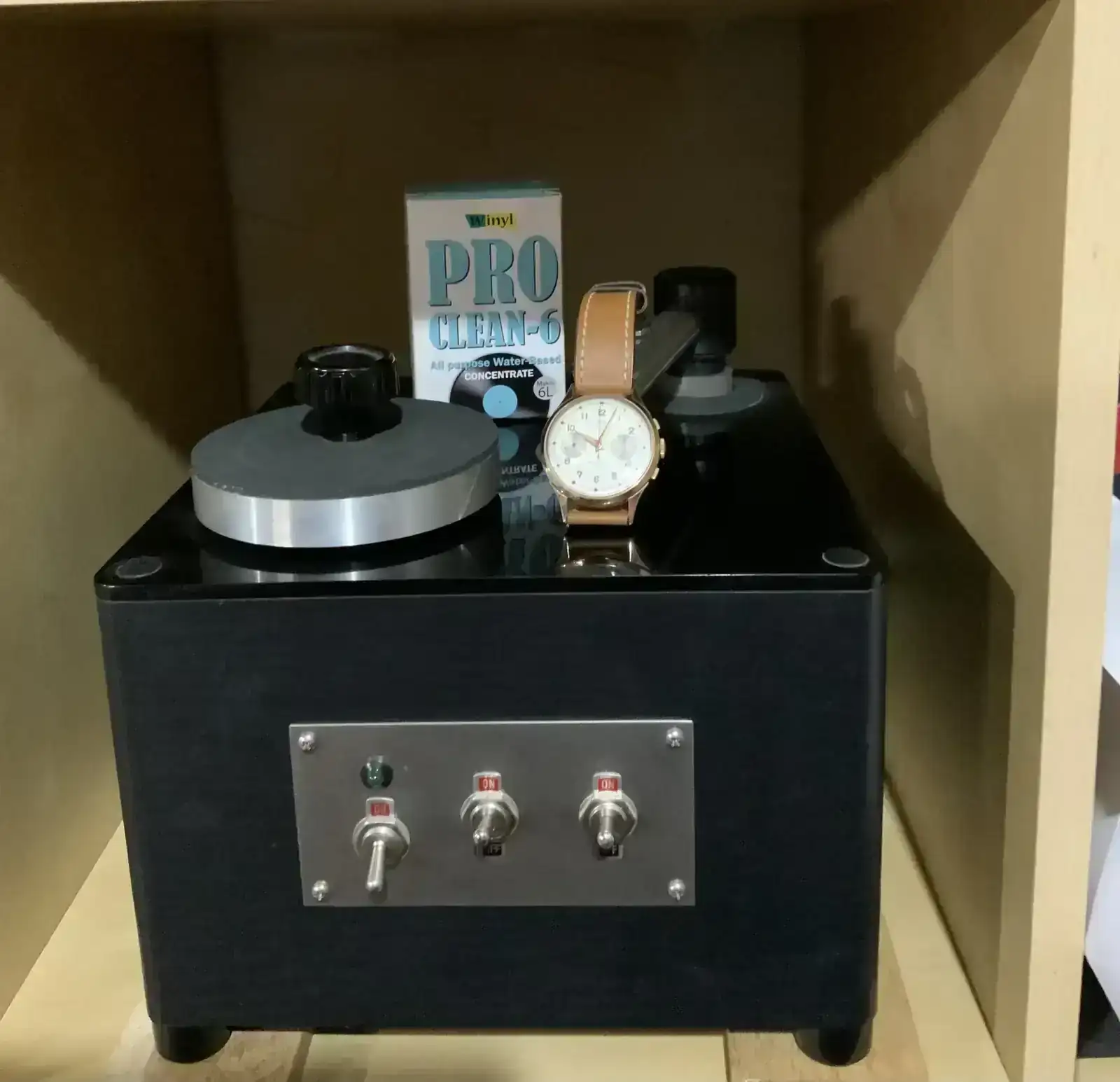 Aparte de discos , instrumentos musicales, reproductores de diversa índole y alguna cosa más aparecida en este espacio, voy con otro artefacto , este para la limpieza de los preciados Lp’s ,una máquina limpia vinilos y detrás aparece el concentrado para hacer la mezcla, simplemente con agua destilada en la proporción indicada por el fabricante, con el cual nada tengo que ver .