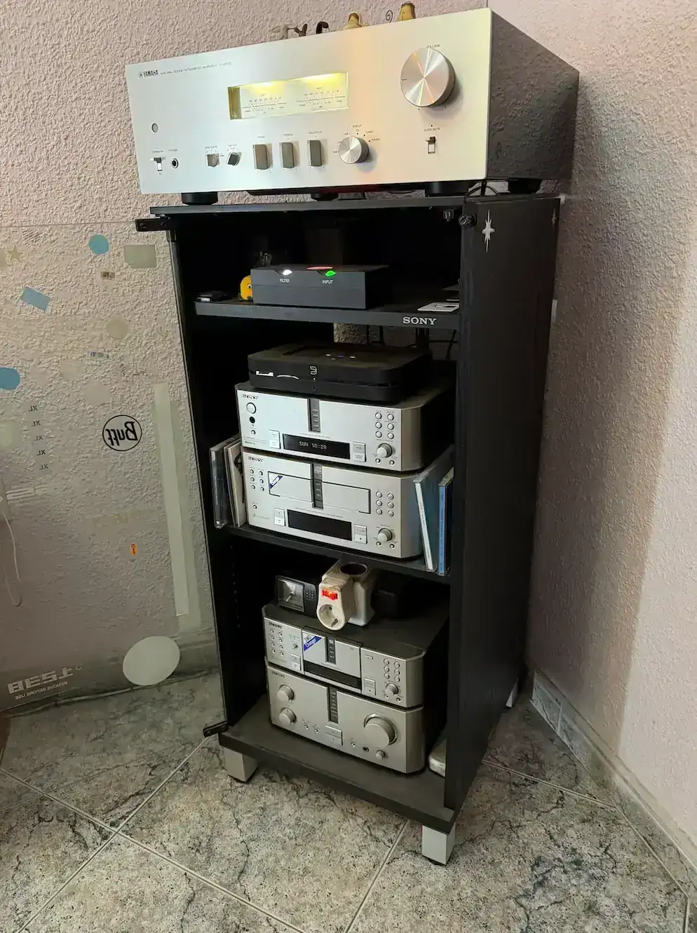 un ampli yamaha, arriba del todo, sobre streamer bluesound, TIDAL, y en medio un dac de chord, el mueble sony tiene ya 40 años mínimo y el equipo sony, MADE IN JAPAN, que todavía funciona, es del 99