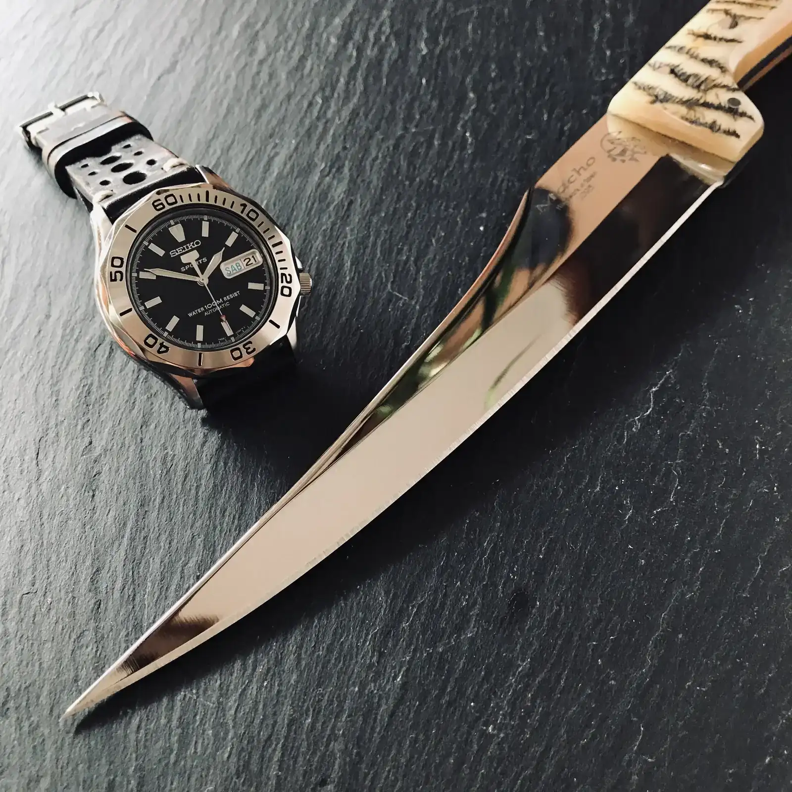 Que filo más guapo compañero!! El mango es de carnero verdad?? Si en algún momento puedes subir una "de cuerpo entero" estaría genial, me gustaría poder ver que proporciones tiene la hoja con respecto a la empuñadura 😊