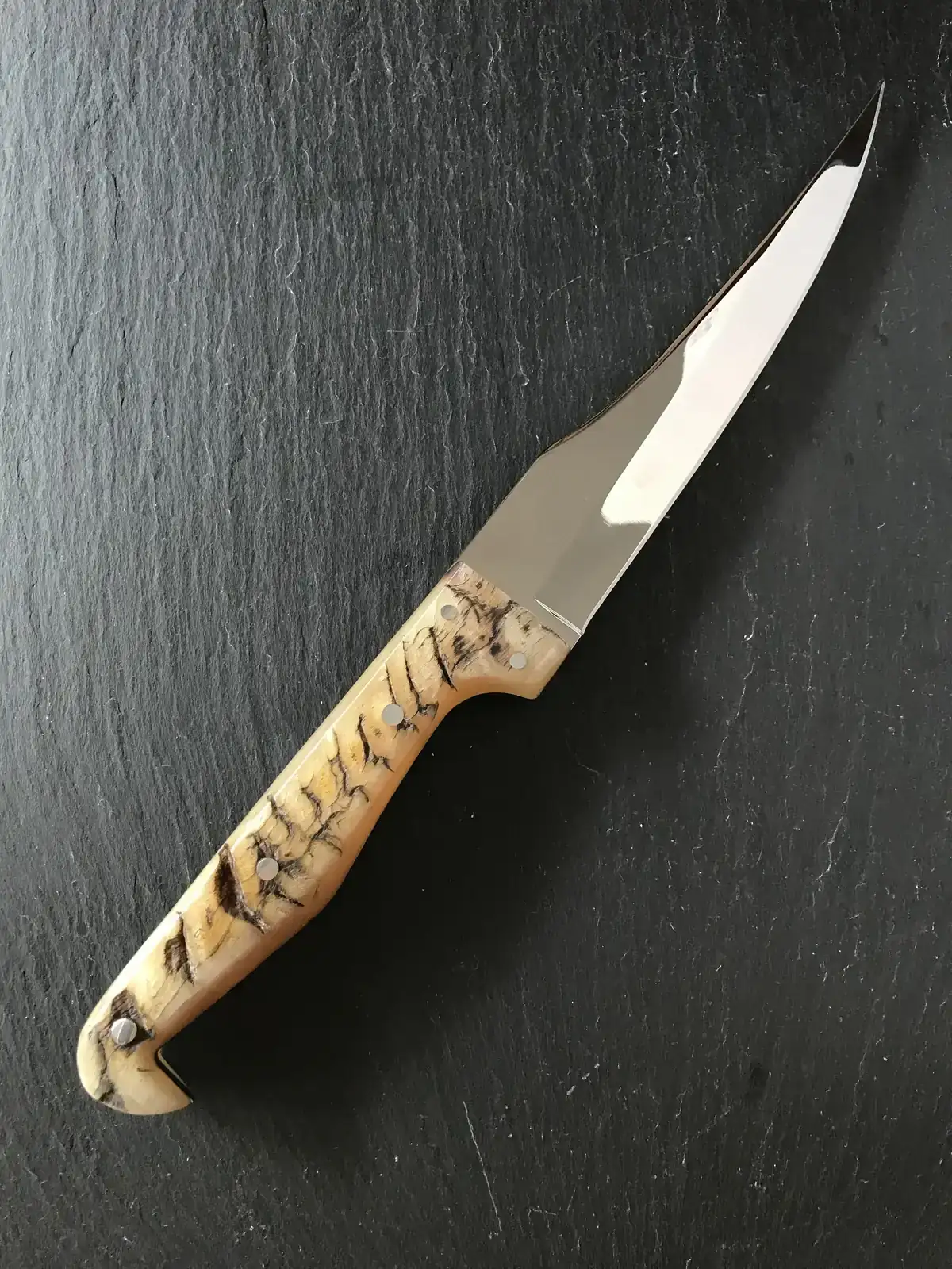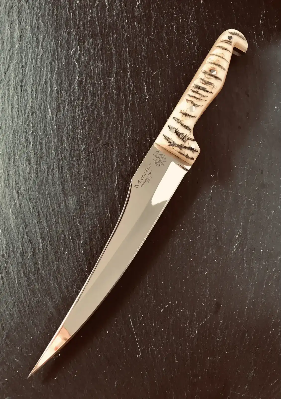 Sí, mango de carnero y hoja enteriza de acero 1095. La hoja tiene 17,5 cm. y el mango 13,5 cm. Te subo un par de fotos más: