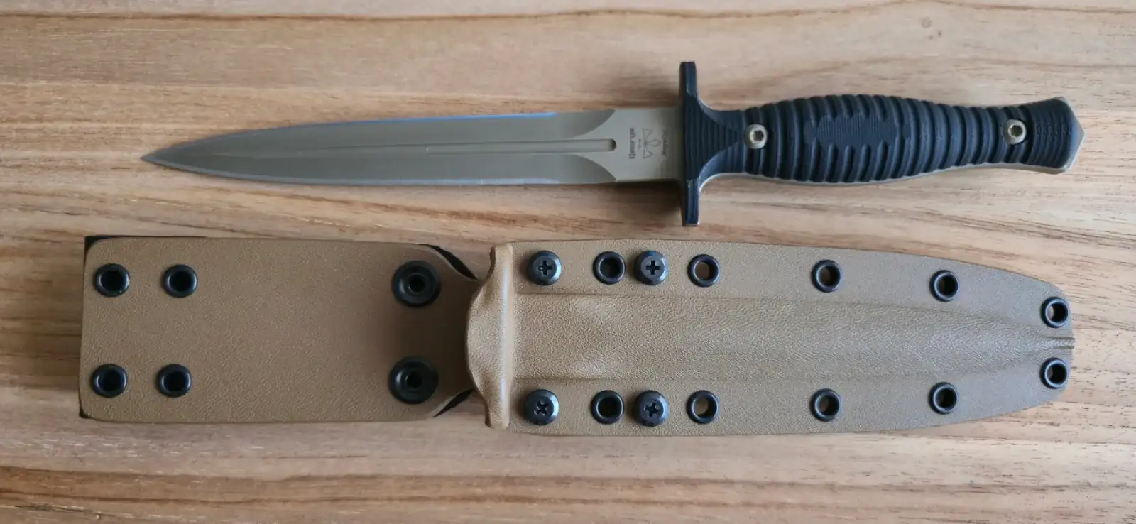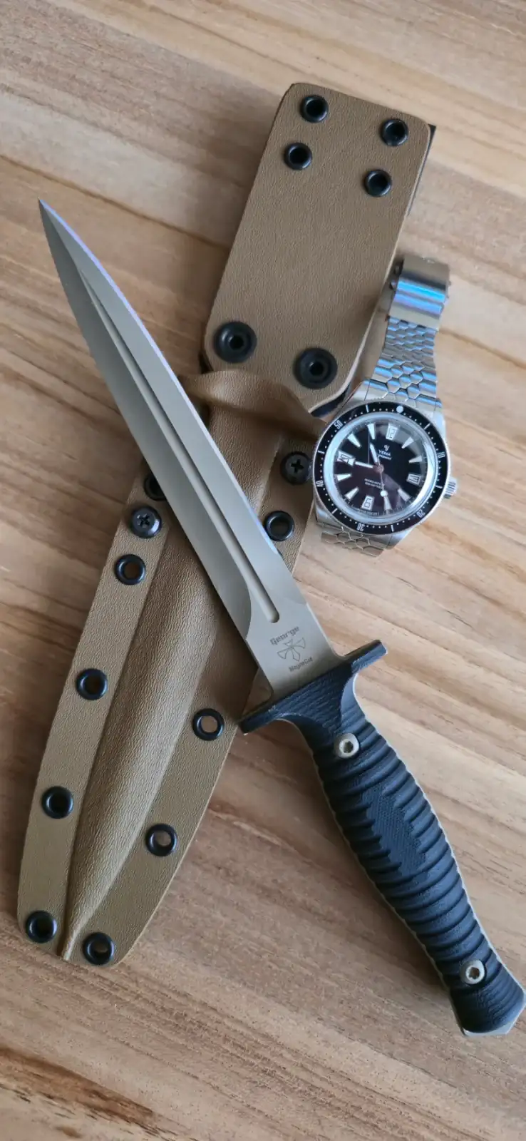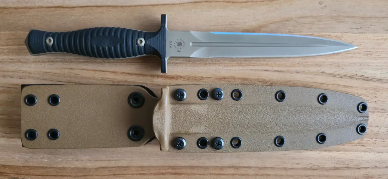La daga que ves es una George V14, de Spartan Blades. El acero es Magnacut con un recubrimiento de nitruro de circonio. El mango es de un material compuesto de resinas y fibra de vidrio. El cuchillo es fantástico.