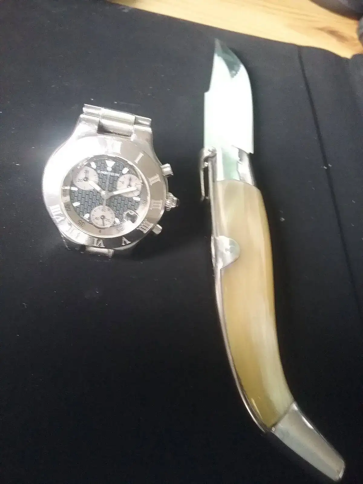Aportando mi Cartier, y una navaja de Albacete de mango de asta de toro,