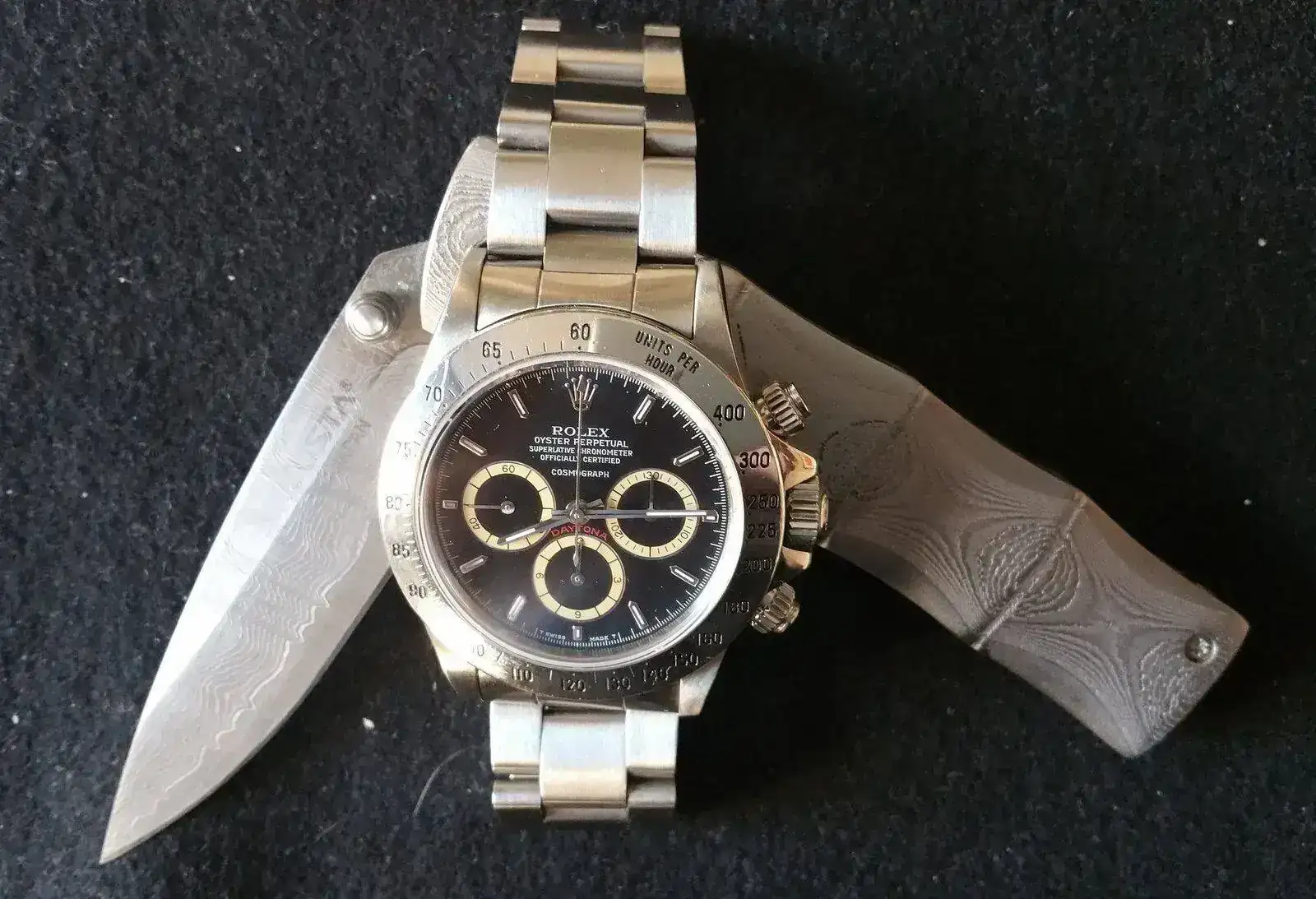 Aprovechando el reloj del foro diario, y aún en pijama hoy de negro con balisong k25 y omega. Perdonad, no soy un experto ni en manejo ni en videos, pero para ser el primero en camara lenta y blanco y negro.