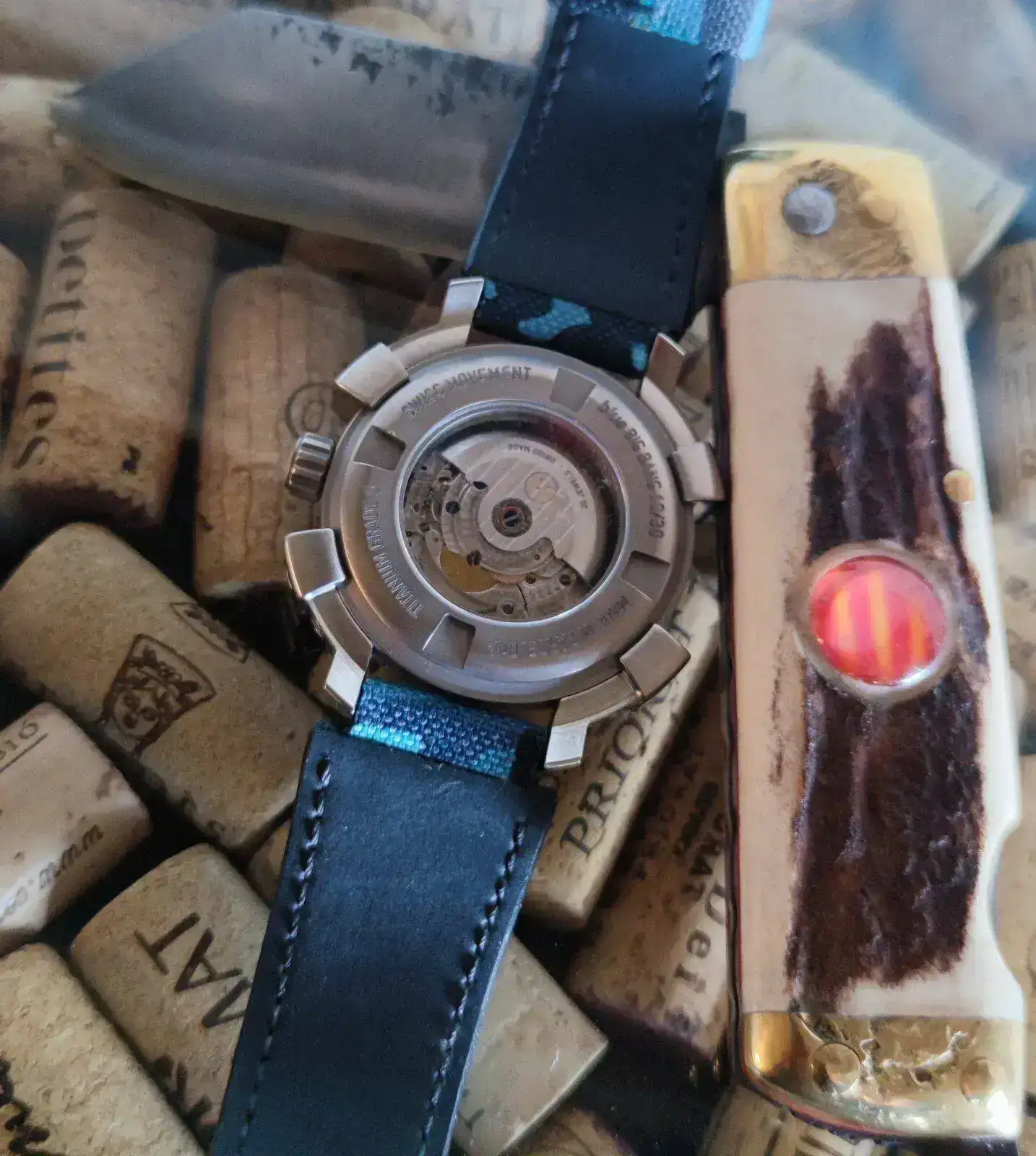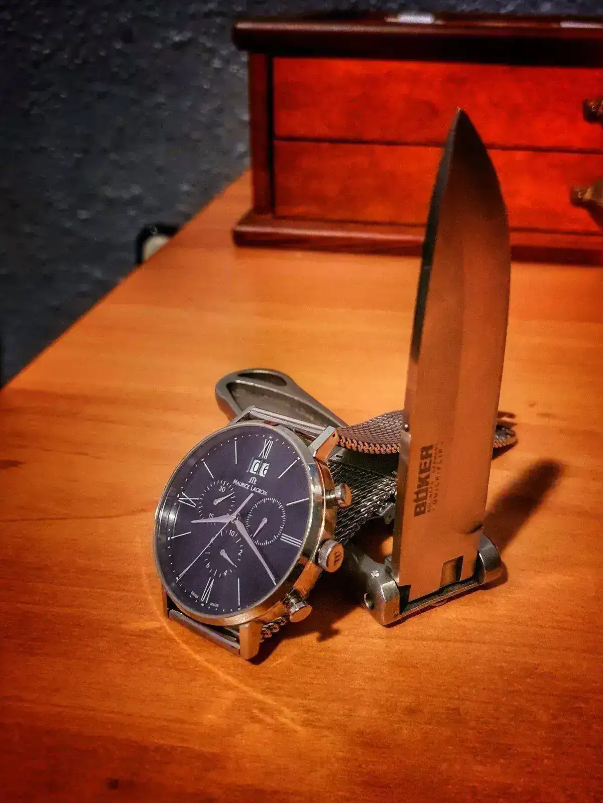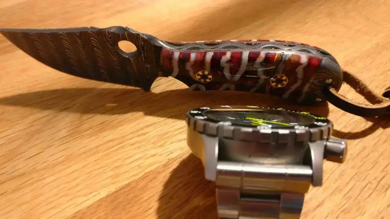 Hoy llevo el Damasko DSub1 (con el armis prestado del Orient Saturation Diver) y este pequeño cuchillo de acero de damasco con cachas de muela de mamut, hecho por el maestro artesano don José Ojeda, en Sayula, México. Posiblemente el único ejemplar de Cuchillos Ojeda en la península ibérica.