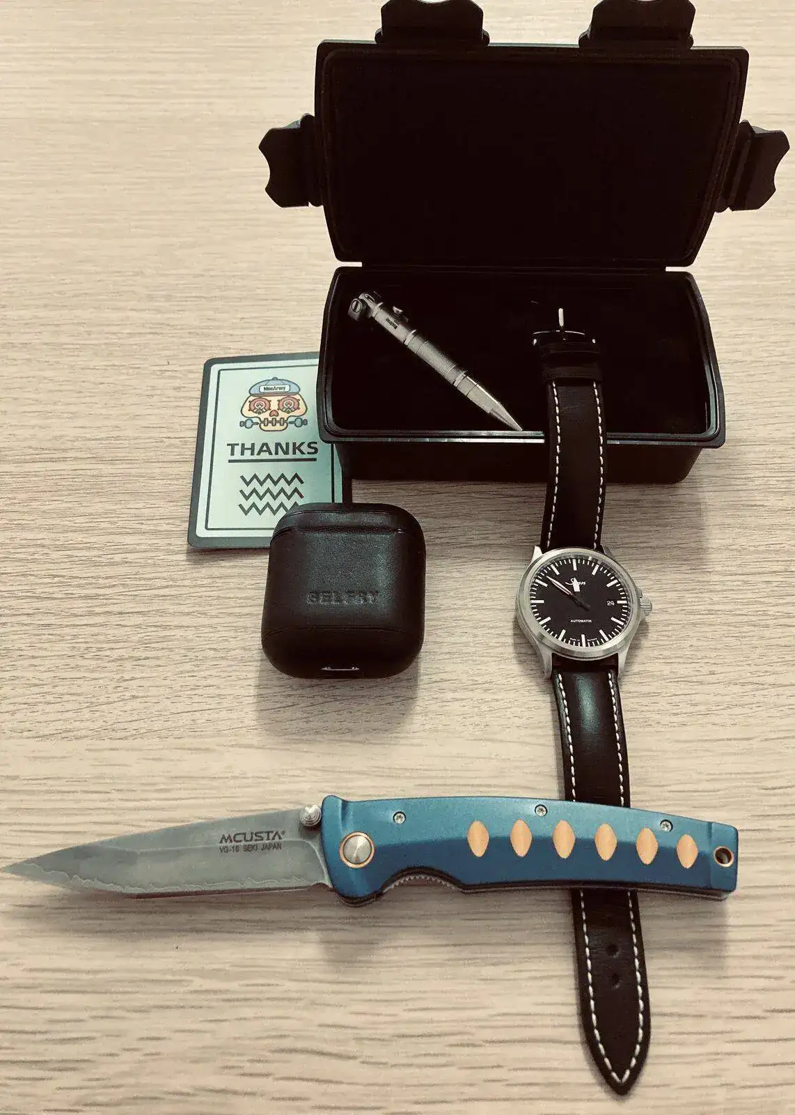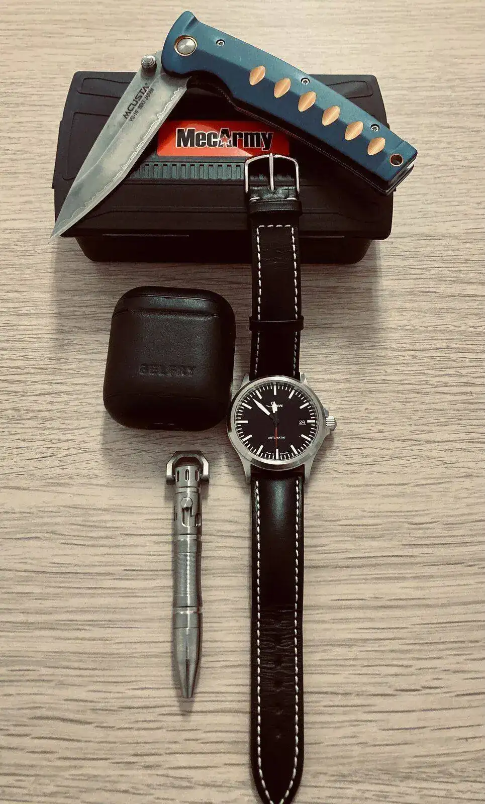 Estupendo combo.Cómo he puesto en el hilo "Relojes y ... ", acaba de llegarme el bolígrafo de titanio EDC de MecArmy, el TPX8 ( y es más pequeño de lo que esperaba ), así que os lo presento acompañado de mi Sinn 556 I RS y una Mcusta, que es lo que le da sentido en este hilo.