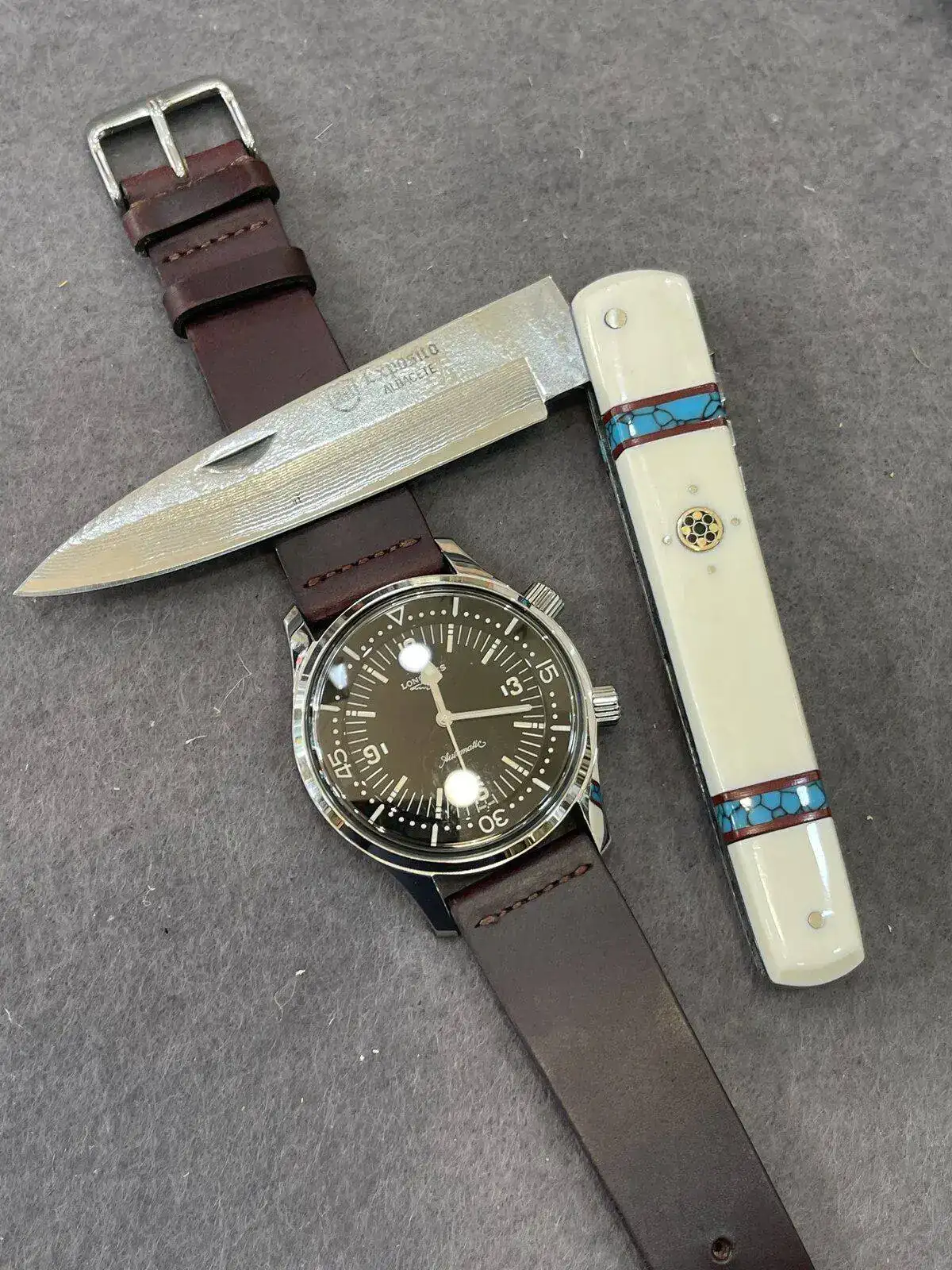 Y me ha tirado “ la tierra “ y está Expósito artesana de cachas de marfil y damasco se ha venido conmigo y con el Legend Diver que llevo hoy .