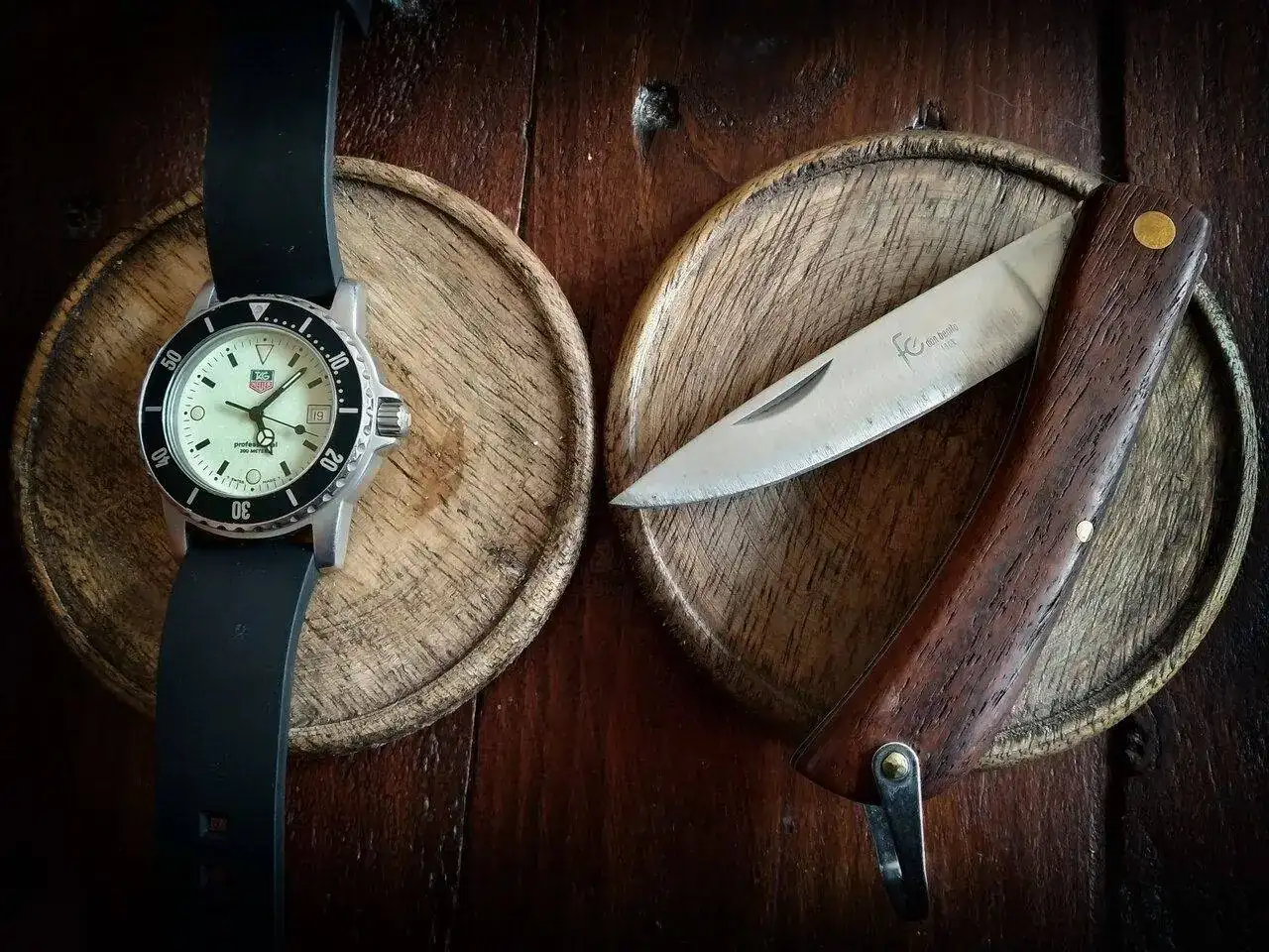 Para el pueblo el tag serie 1500 de 37 con una correa de caucho para los calores y una navaja normalita de Don Benito, que nunca se sabe cuando te sacan el chorizo y el queso y hay que estar preparado siempre.