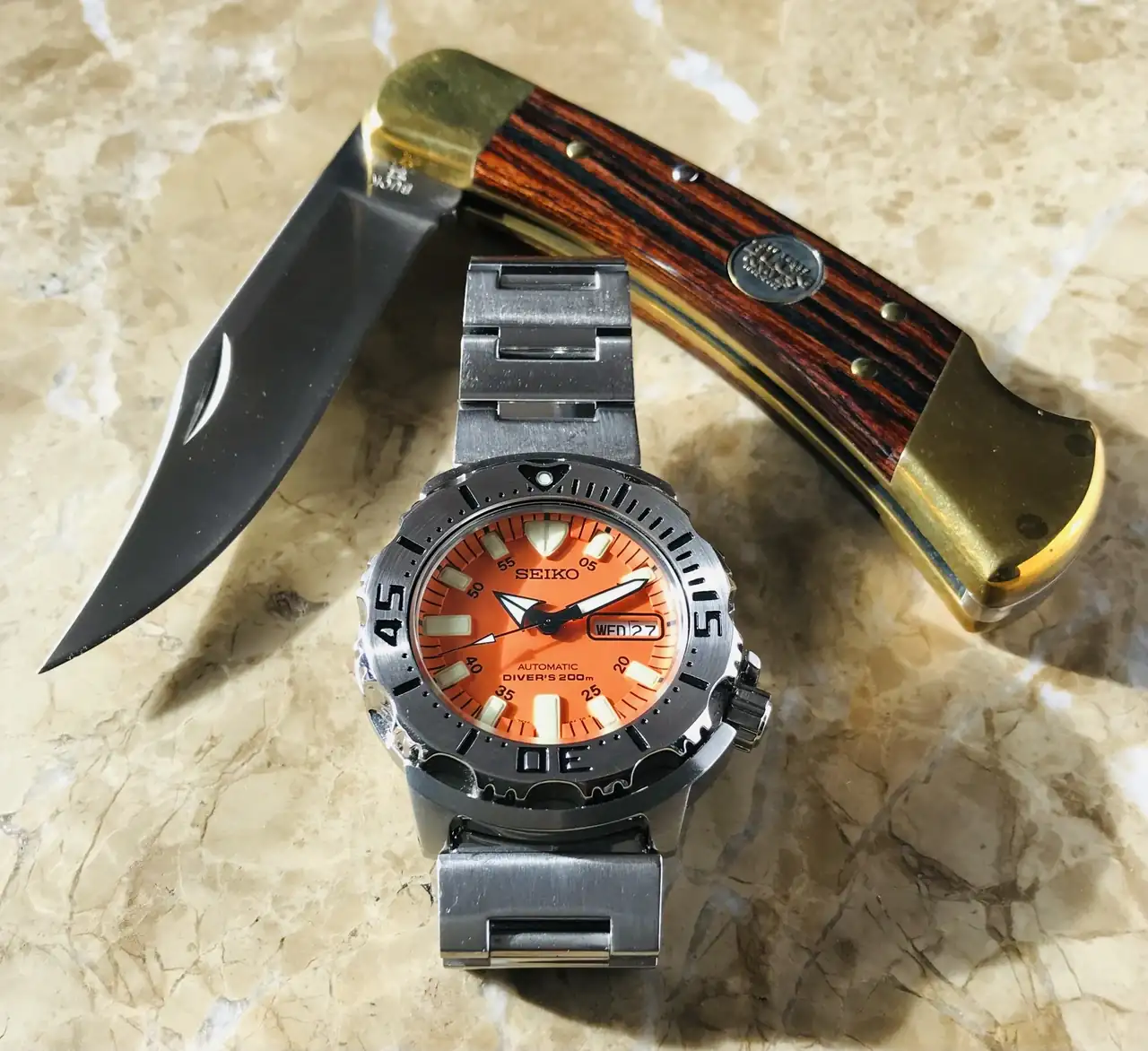 Precioso par !Seiko Orange Monster y Buck 110, modelo conmemorativo del primer centenario.