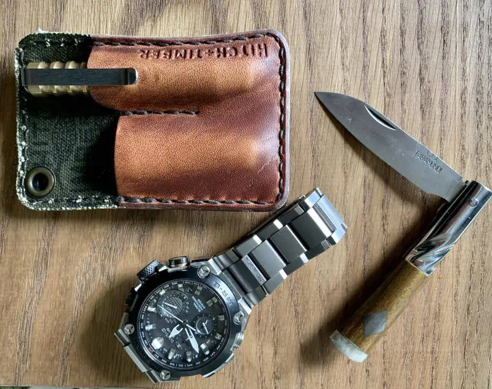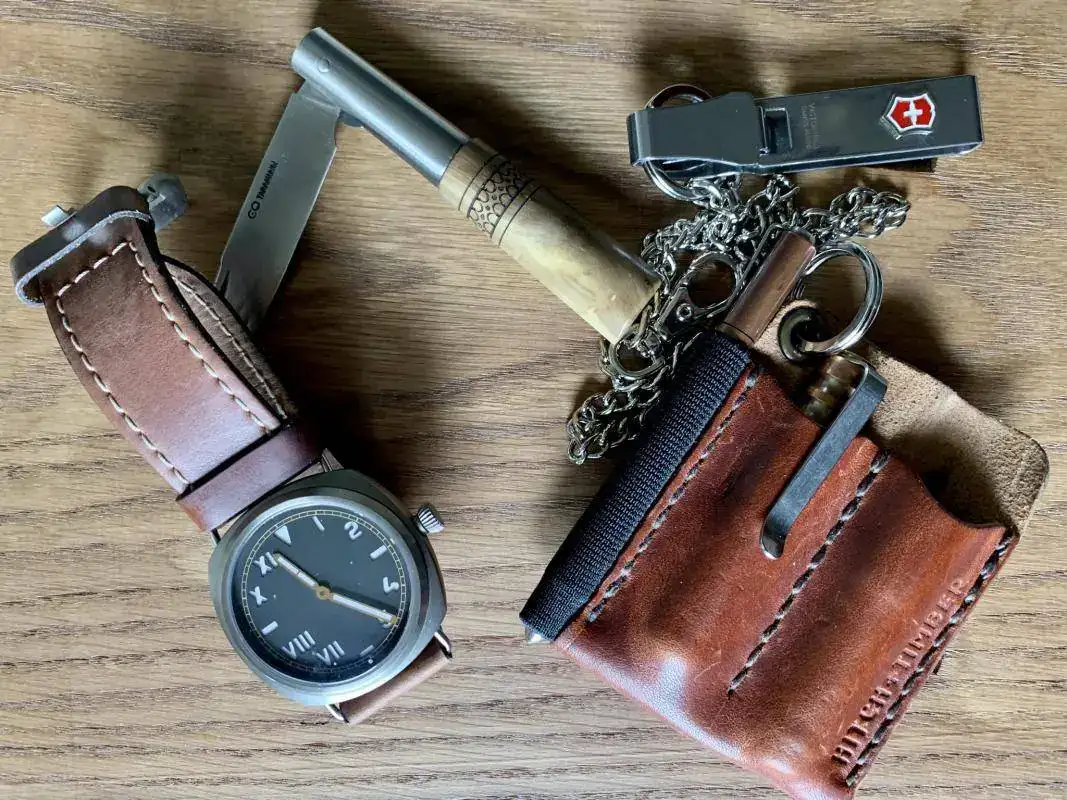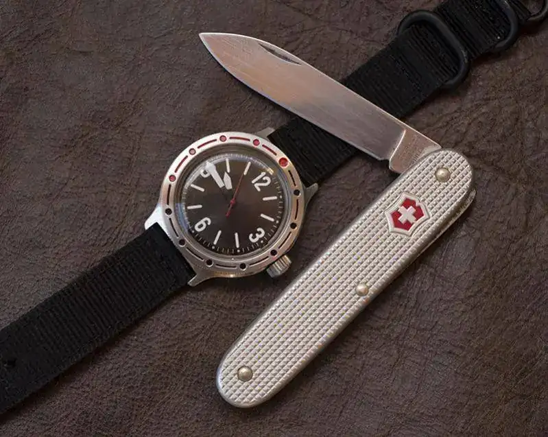 kit de urbanita listo para todo! de mi abuelo y de mi padre, heredé la costumbre de llevar siempre una navaja, por suerte vivo en zona medio rural, pero en la ciudad se ve muy raro que saques del bolsillo una navaja, yo soy incapaz de hacerle daño ni a una mosca, pero aun que sea para cortar una etiqueta de una prenda recién comprada o lo que sea.... se ve raro, para ello una victorinox classic no puede passar mas desapercibida y es lo menos "intimidante" que conozco, en cuanto al reloj.. últimamente me pirran los rusos, así que un mod komandirkie que queda bien con lo que suelo llevar puesto!