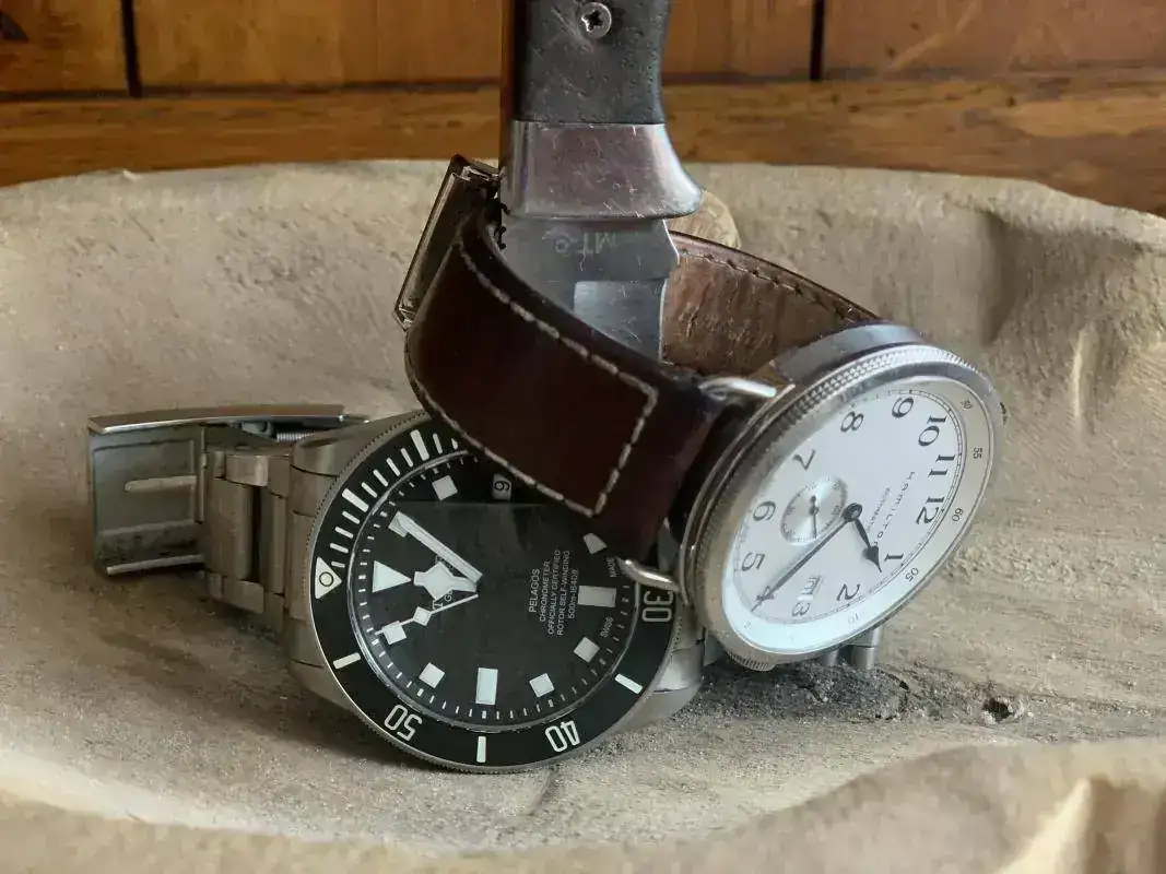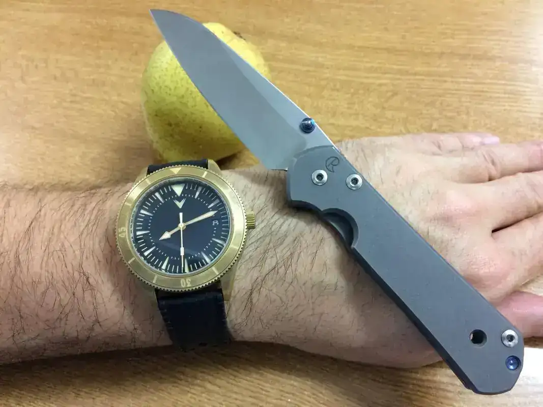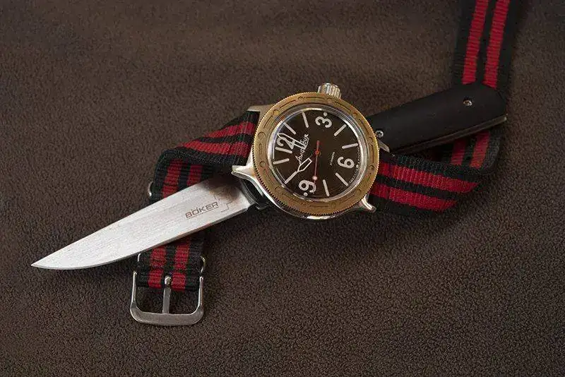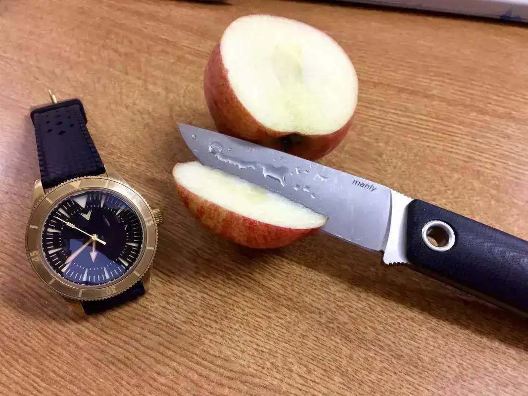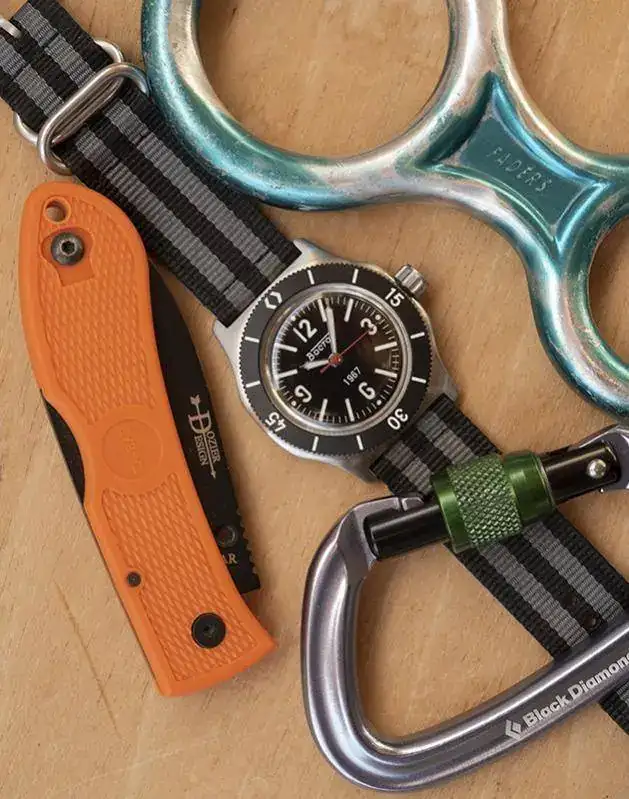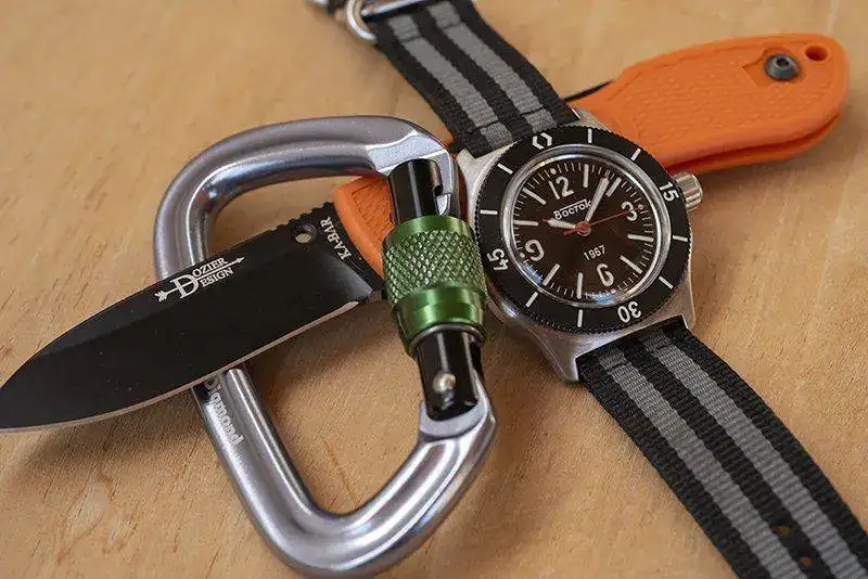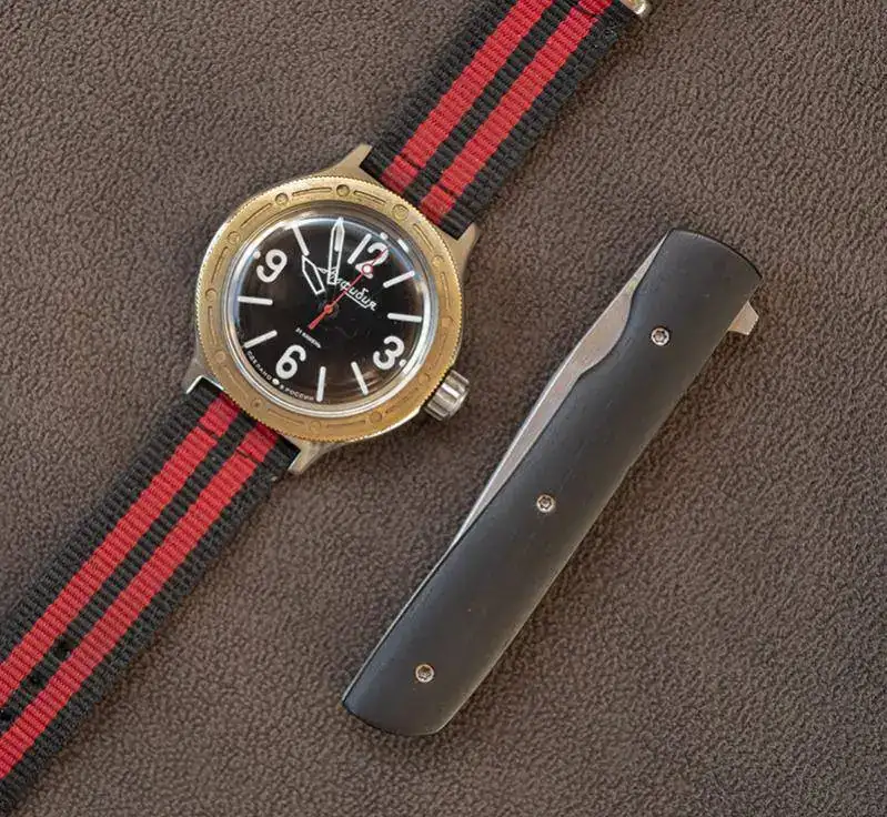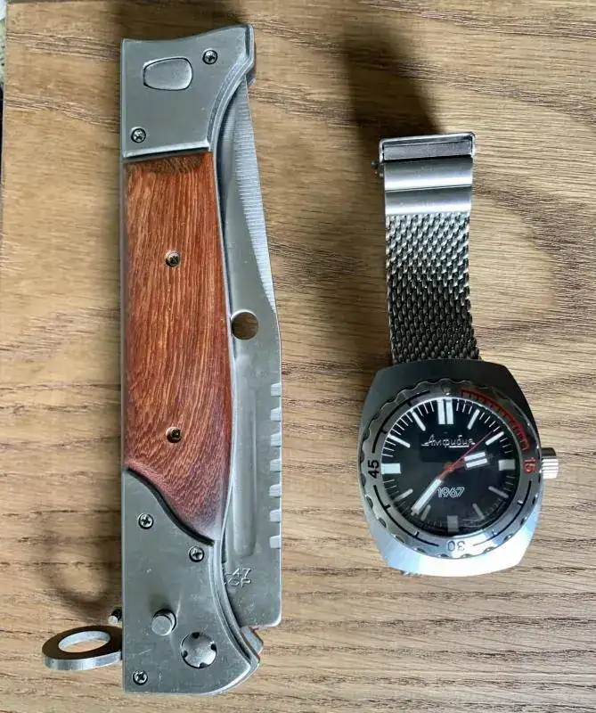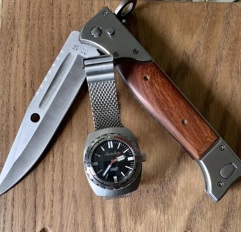 Kit Tramontana!.... vivo en zona de mar y monte, he intento disfrutar de los dos, una ka-bar Dozier con acero aus-8a.. es una navaja económica ligera y práctica con un acero normalito pero muy fácil de afilar. El raloj, otro mod amphibia con caja 100, que la verdad luce muy bien en la muñeca.
