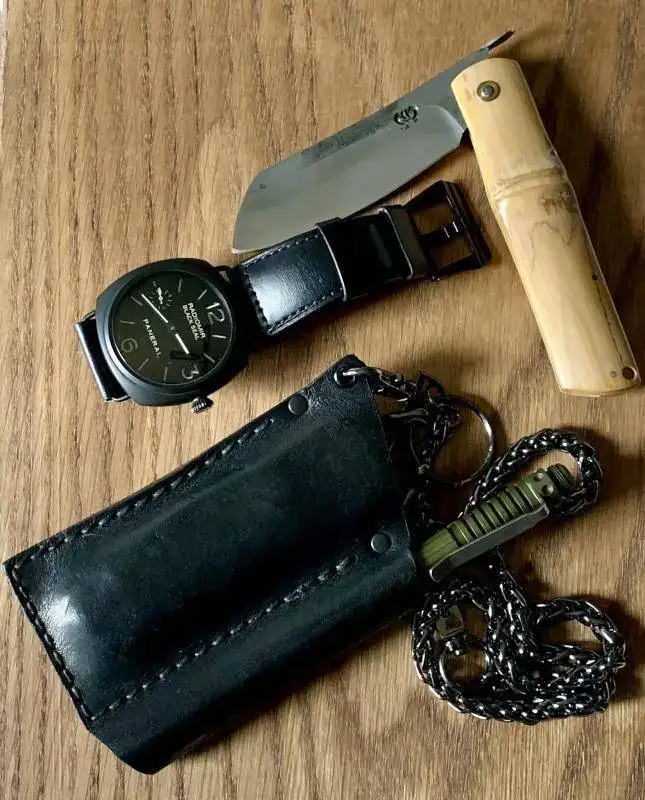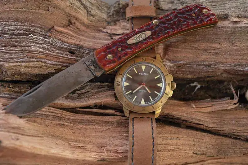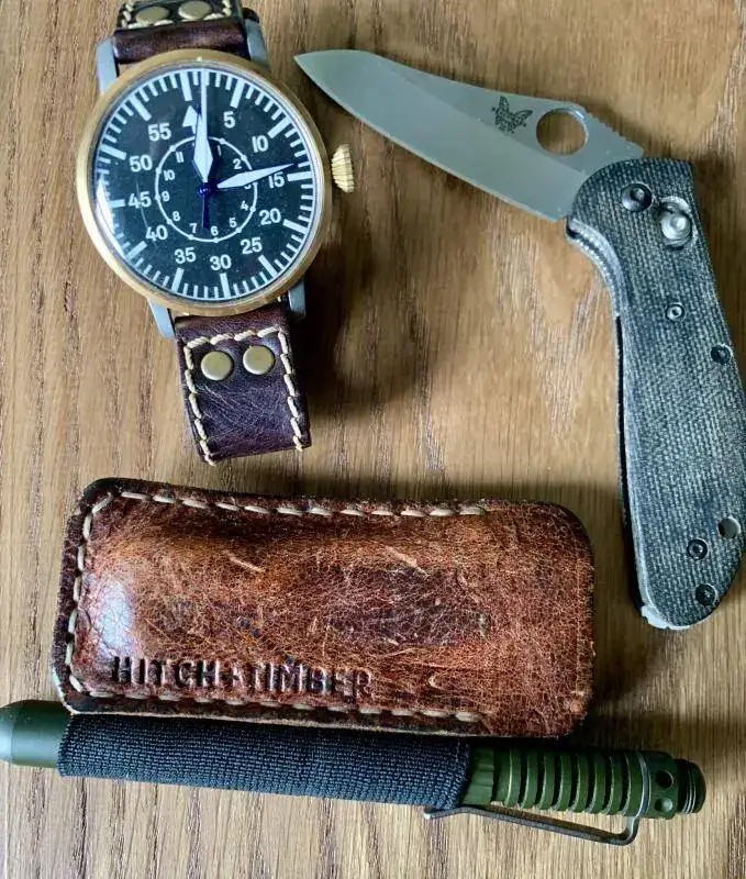 Kit estilo vintage! La famosa navaja Sodbuster de la marca Case,... muy americana, como las Harley, con cachas de cuerno y acero carbono, tengo que decir que la navaja estéticamente me gusta mucho... es una pasada como ya viene de fábrica que parece que ha sido usada... tiene una pátina, un pulido un no se que muy auténticos, pero el acero es el peor con el que me he topado.... cuesta un montón afilarlo y pierde el filo muuuuy fácil... así que la verdad es que no la uso. El reloj, un komandirskie caja 43 y modificado con una esfera de Vostok antiguo, con correa bastante cutre hecha por mi.