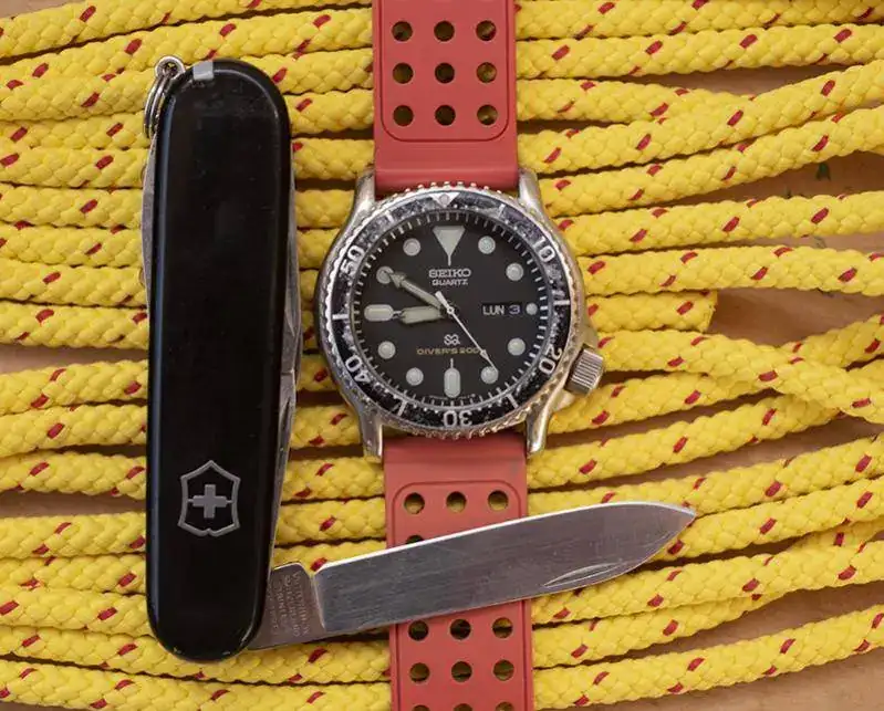 Mi mayor pasatiempo deportista, el kayak de mar... El Seiko quartz diver que llevaba casi siempre mi padre y una victorinox spartan que antes era roja, pero se le rompió una cacha y se las puse negras, siempre en un bote estanco con otros materiales de seguridad!