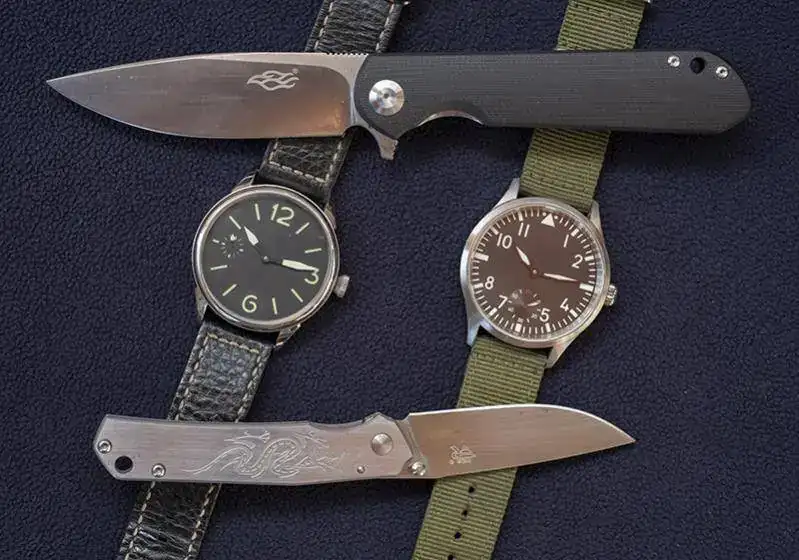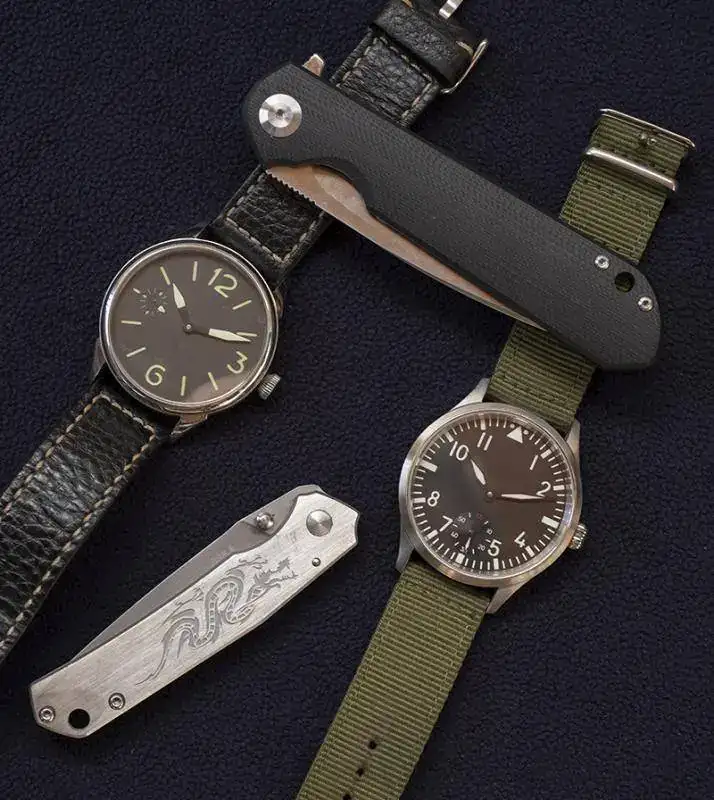 Kit made in China!... Para acabar y como no un par de chinos... como era de esperar y ya sabreis los aficionados a las navajas, también los chinos hacen cosas super interesantes mucha copia, por supuesto, pero también algunas mas originales, en este caso arriba una Ganzo firebird con acero D2 y cachas de G10 muy bien acabada y con apertura a una mano tipo flipper que funciona con una suavidad increíble, para mi gusto es demasiado grande y no la uso mucho, la de abajo una Sanrenmu, marca que ya se ha convertido en referencia para quien busque navajas chinas muy decentes, mango de acero inox y hoja de 12c27 que se afila muy bien. Los relojes, derecha... el típico flieguer con movimiento seagull 6498 de 44mm. de diámetro y a la izquierda un mod con dial estilo MM y movimiento 6497, los dos después de ajustarlos un poco van con una exactitud alucinante!