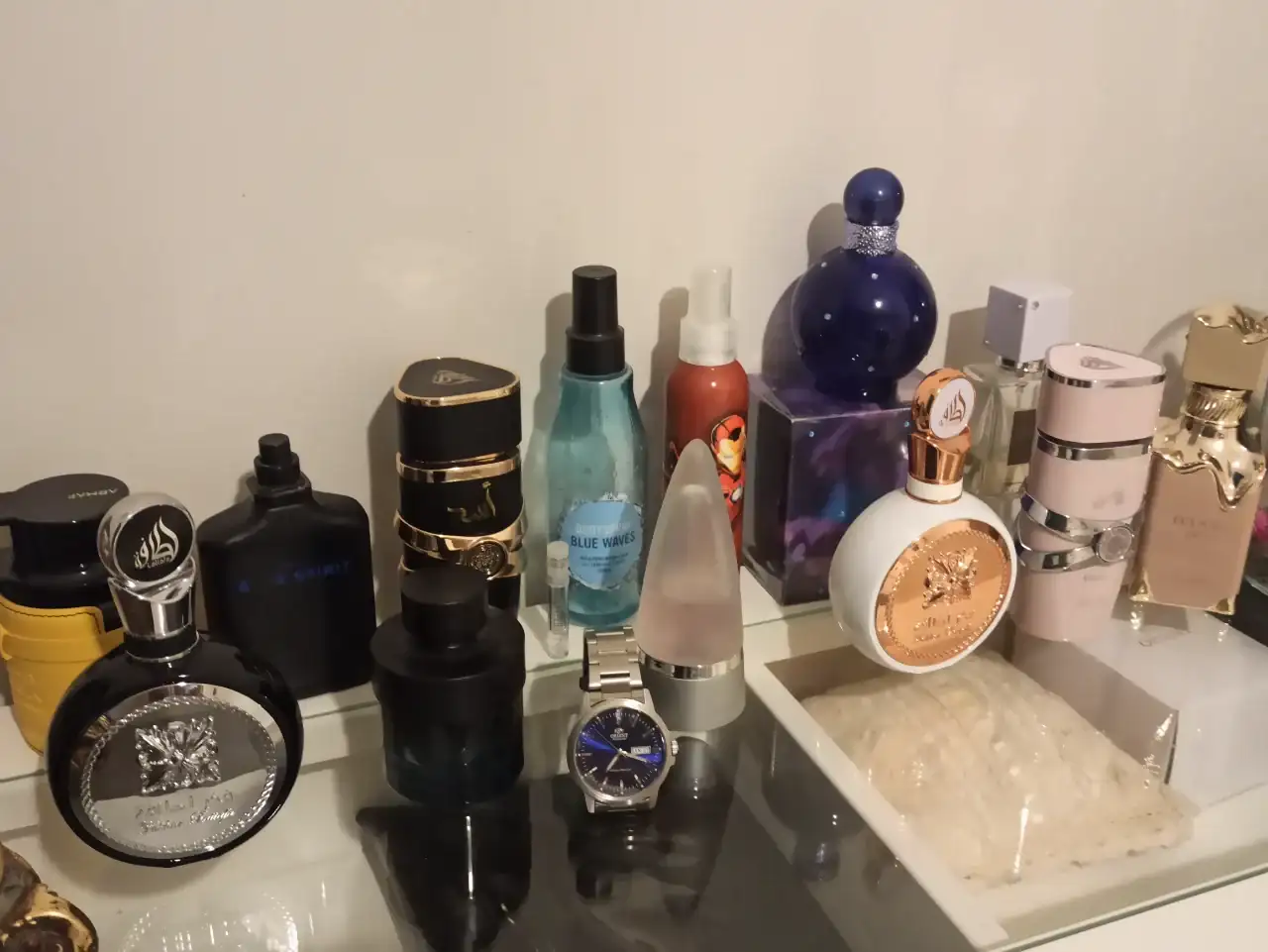 Pues si, creo que todos hemos pecado alguna vez con un perfume árabe, yo me encargué justamente ese Assad de Lattafa debido a su hype, pero me resultó pésimo.Os dejo mi pequeña colección de perfumes, junto a los de mi mujer (y uno de iron man de mi niño jejej) Hay unos cuantos arabes, sobre todo femeninos, cuestion de economia, pero es que como regalo, con los packaging que tienen son perfectos. Mi Orient se complementa con ellos y queda todo muy oriental.