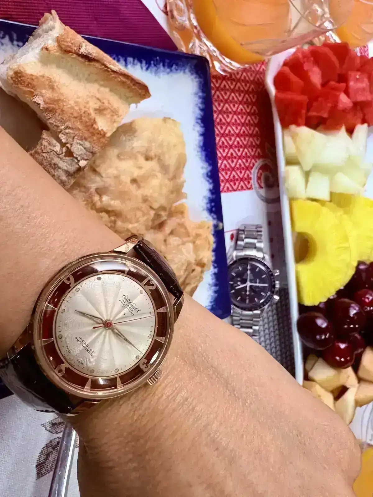 El reloj de arriba es un Cristal Watch, un vintage sencillo y resultón de esfera texturizada de los que suelen llamar semi-esqueleto, por tener los marcadores horarios en esa especie de sándwich exterior que va unido a la carrura (en este caso, en lugar de transparente está coloreado en rojo) Te dejo foto de otro día, que me lo probé en un desayuno