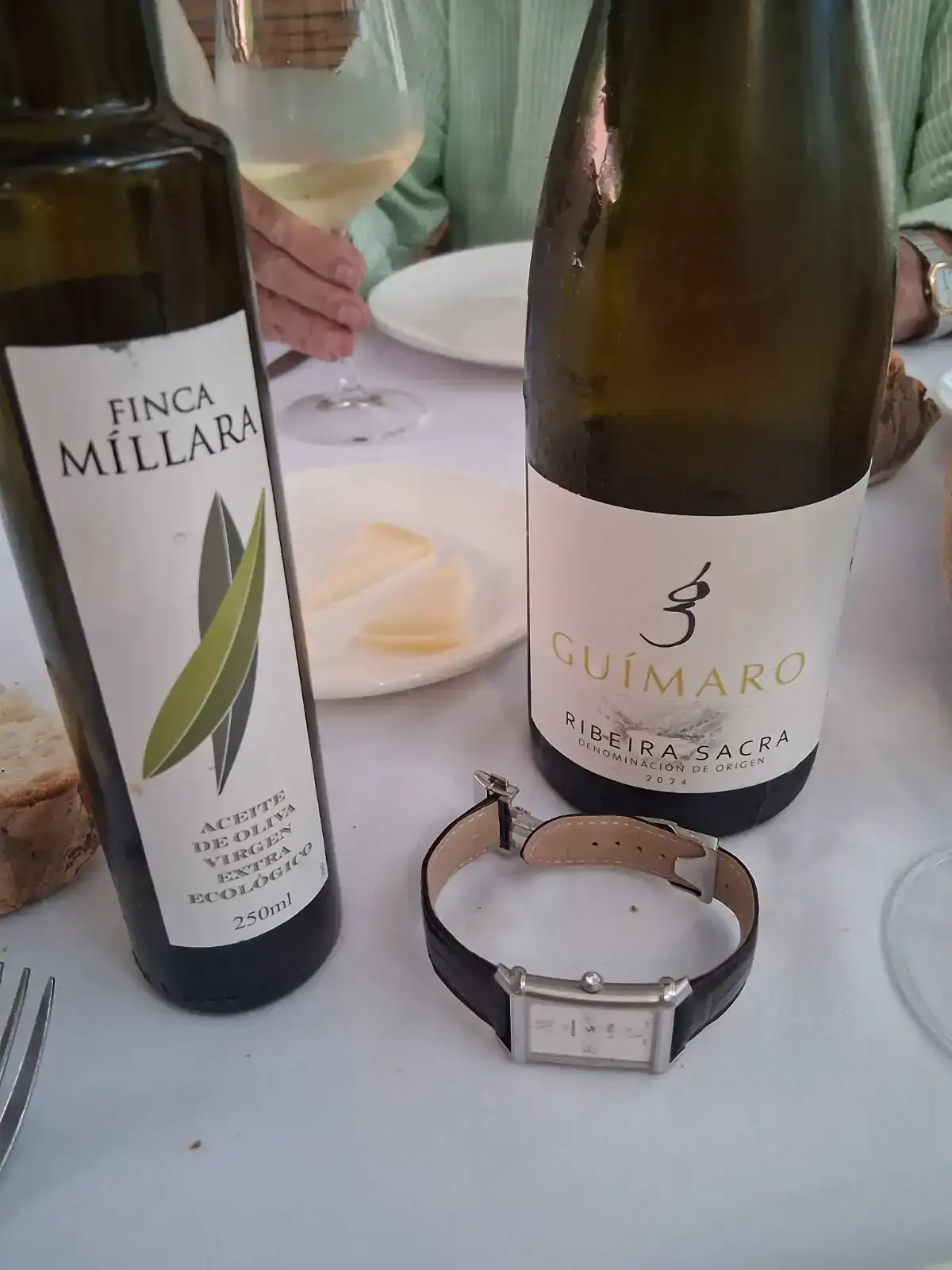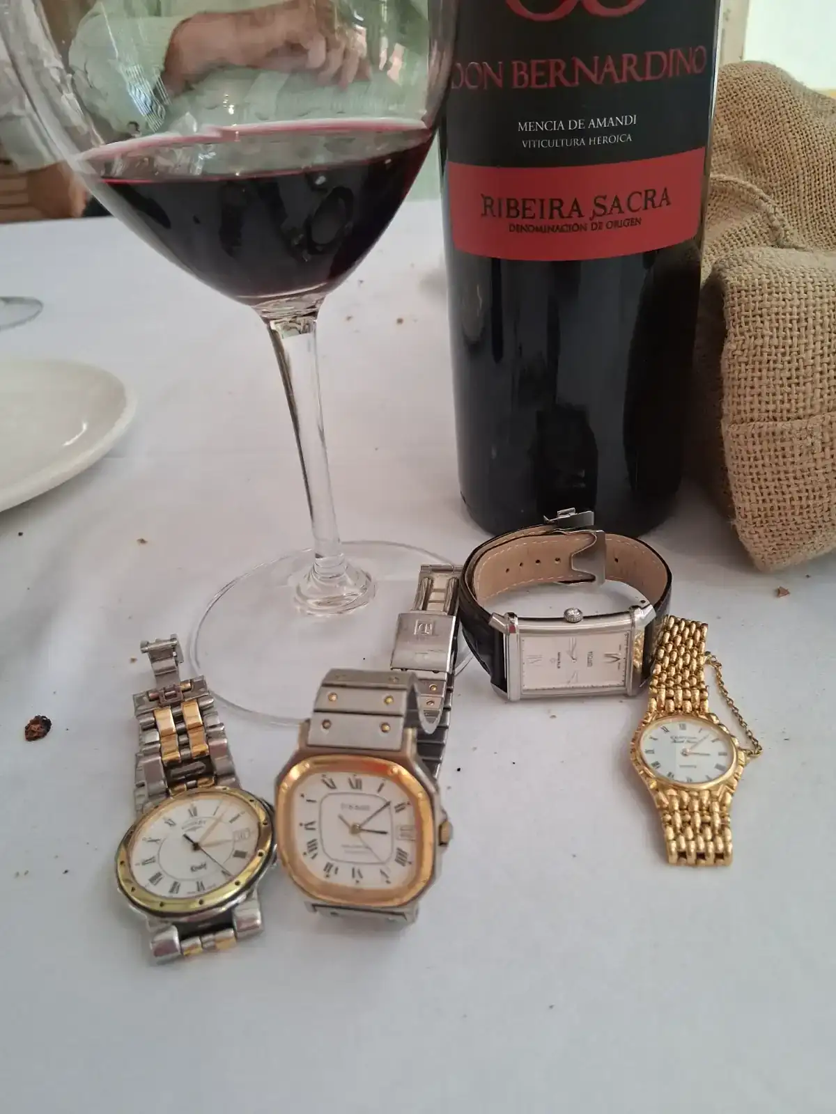 Los relojes, no se quedan atrás.Hoy, para variar, otro Ribeiro, en concreto, de Santa Cruz de Arrabaldo. En este caso polivarietal: Treixadura, Albariño, Godello y Loureira. Muy, muy rico.