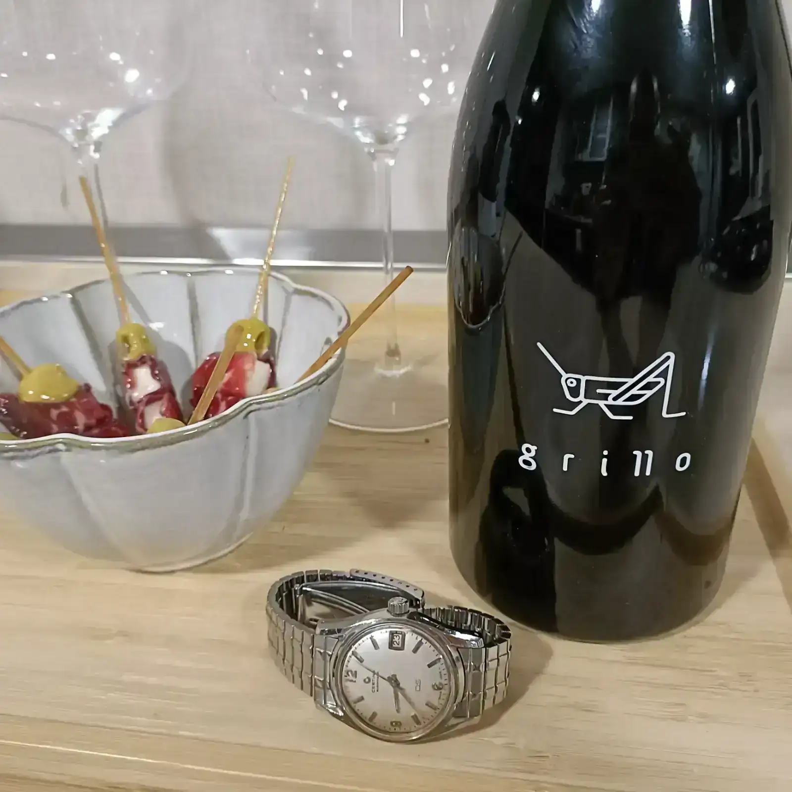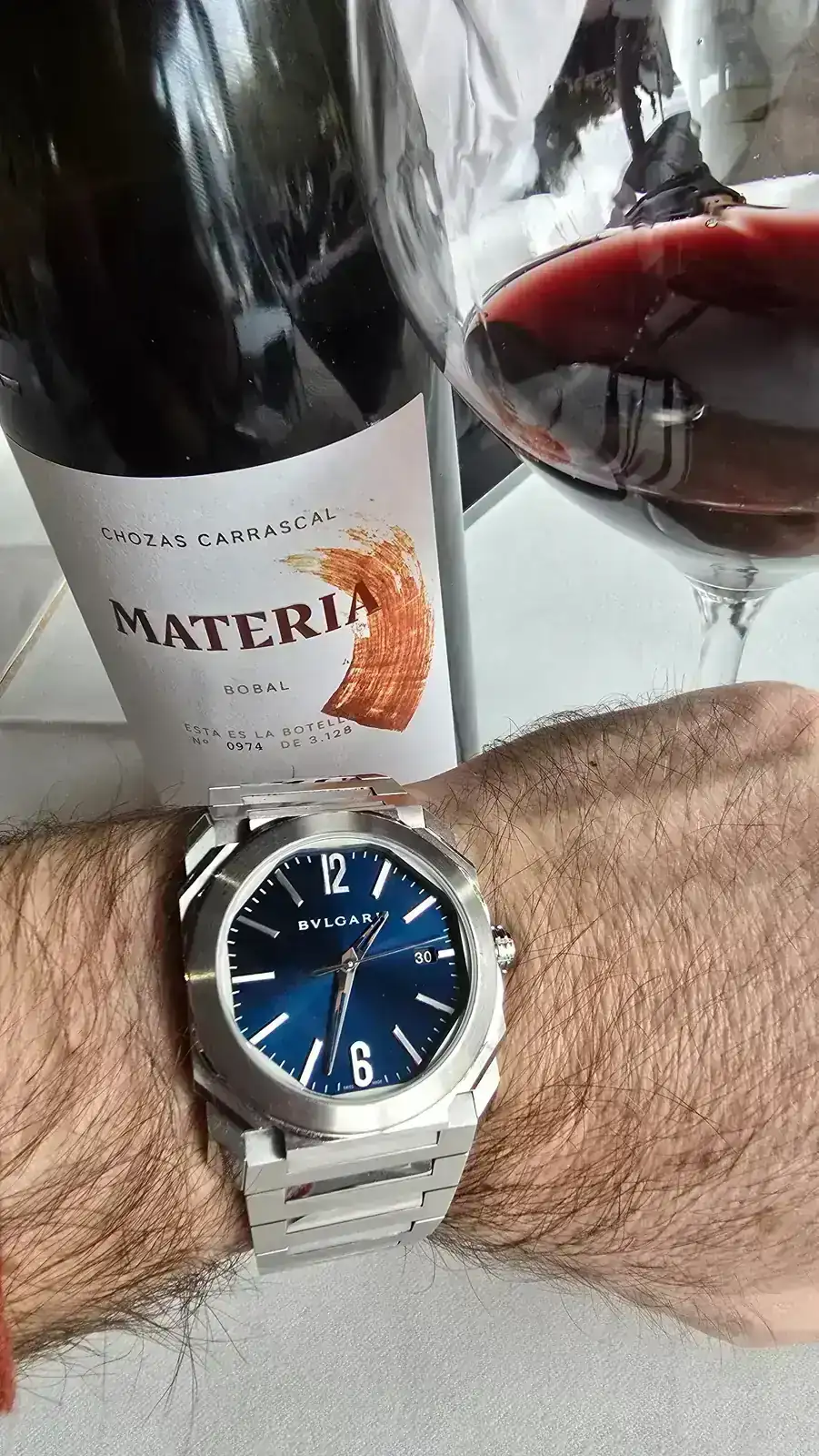 No se si le gusta más el vino, el arroz o el bvlgari, bueno… si lo se 🤣Para comer hoy paella de setas y un maridaje con una excelsa Bobal de Requena. En muñeca el Bulgari Octo azulito.