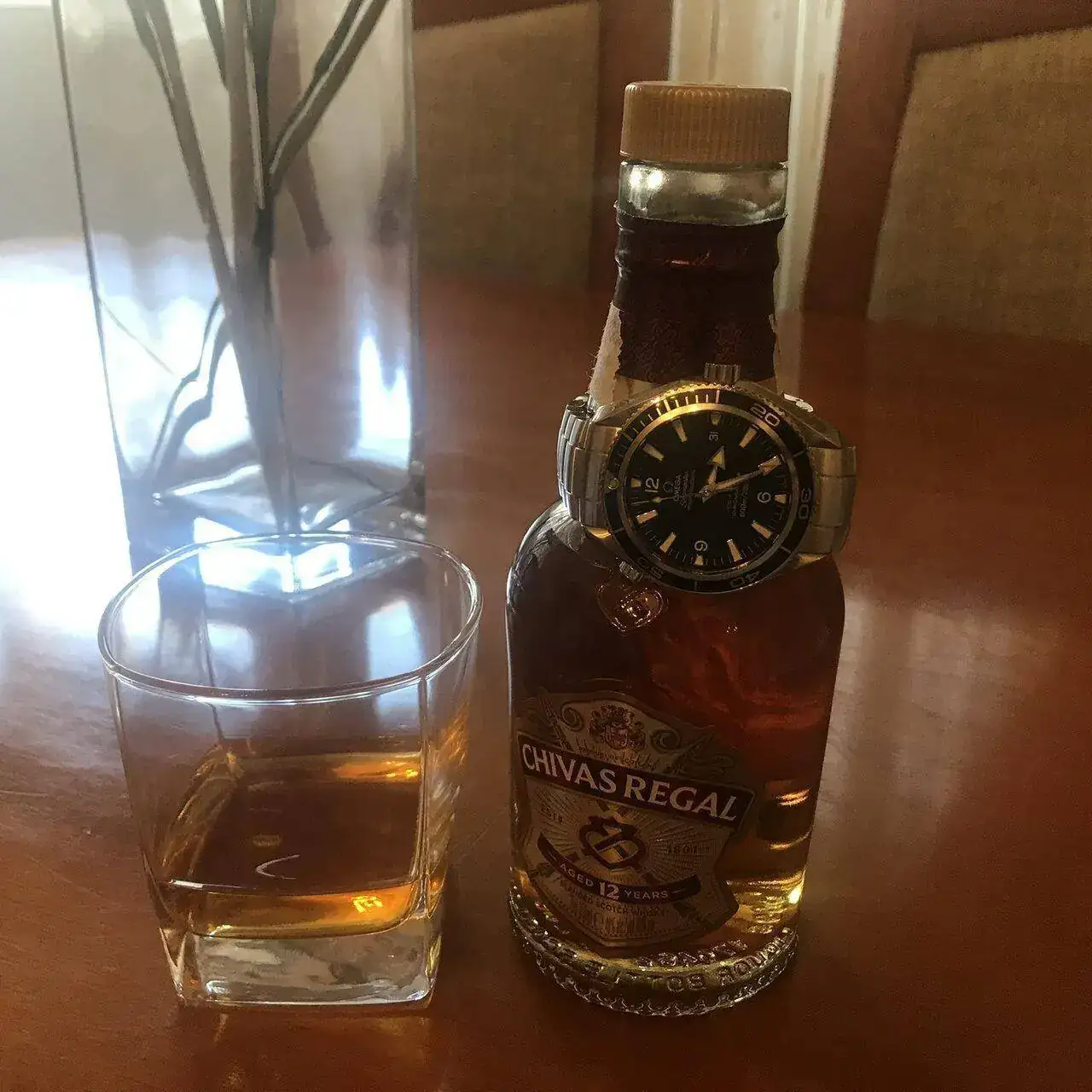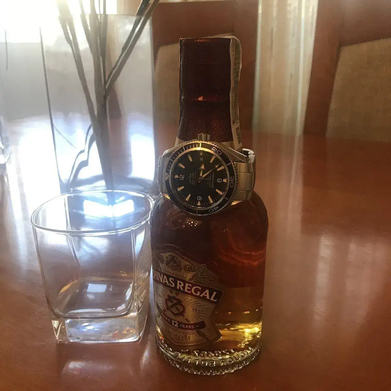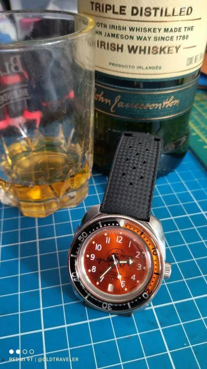 El reloj, es el ruso que me puse hoy, el vaso lleno de polvo (lo guardo en mi taller ) si lo ve mi MDD seguro me monta una bronca, pero lo importante es el contenido, un whisky totalmente recomendable.