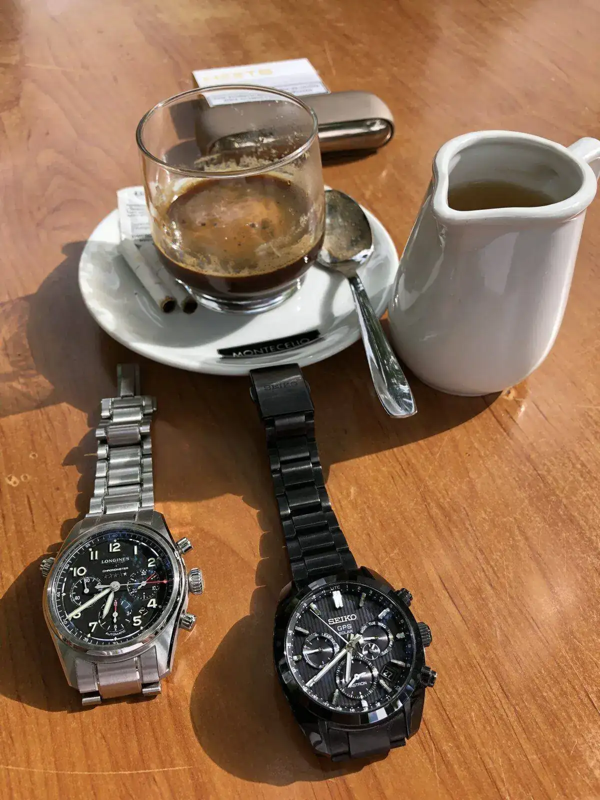 Que bonito es ese Longines 😍😍😍😍El whisky está en la jarrita, flameando a gusto para el carajillo. DYC, por supuesto.