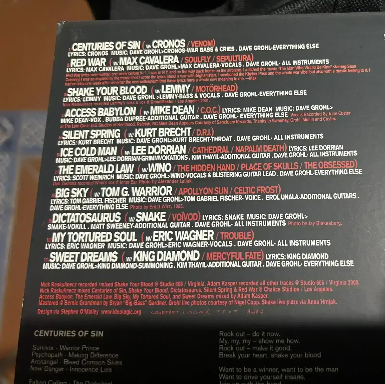 Me escuché el de Lemmy y Cavalera, molan.Dave Grohl , que fuera batería de Nirvana y luego se montó Foo Figthers , se permitió hacer un proyecto Metalico y en cada tema cantaba un cantante diferente del rollo , en una de las fotos más o menos se ve el tema y músicos participantes .