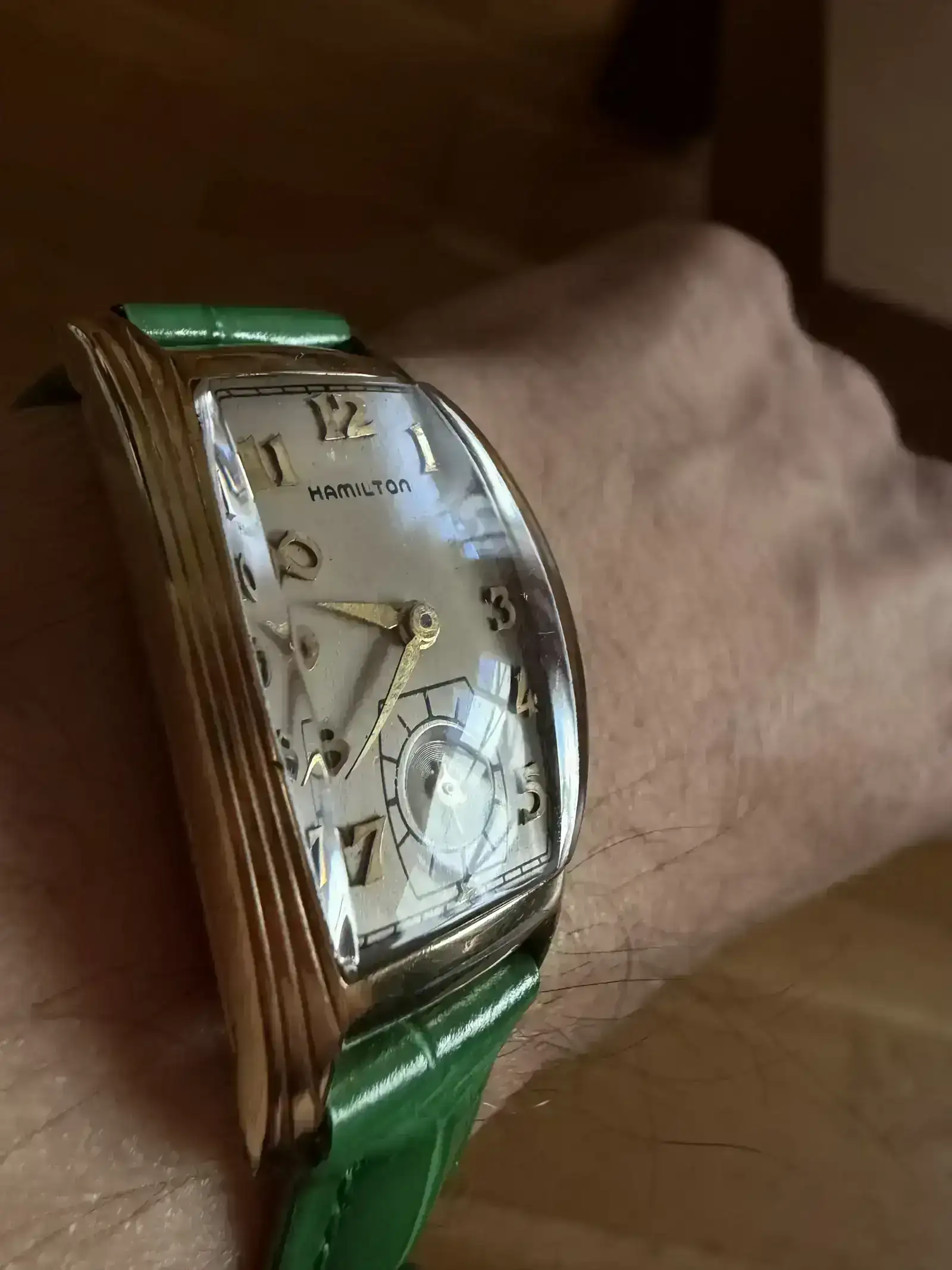 El Hamilton es precioso con su caja rectangular, small seconds, Ãndices arábigos y correa clorofÃlica.👌