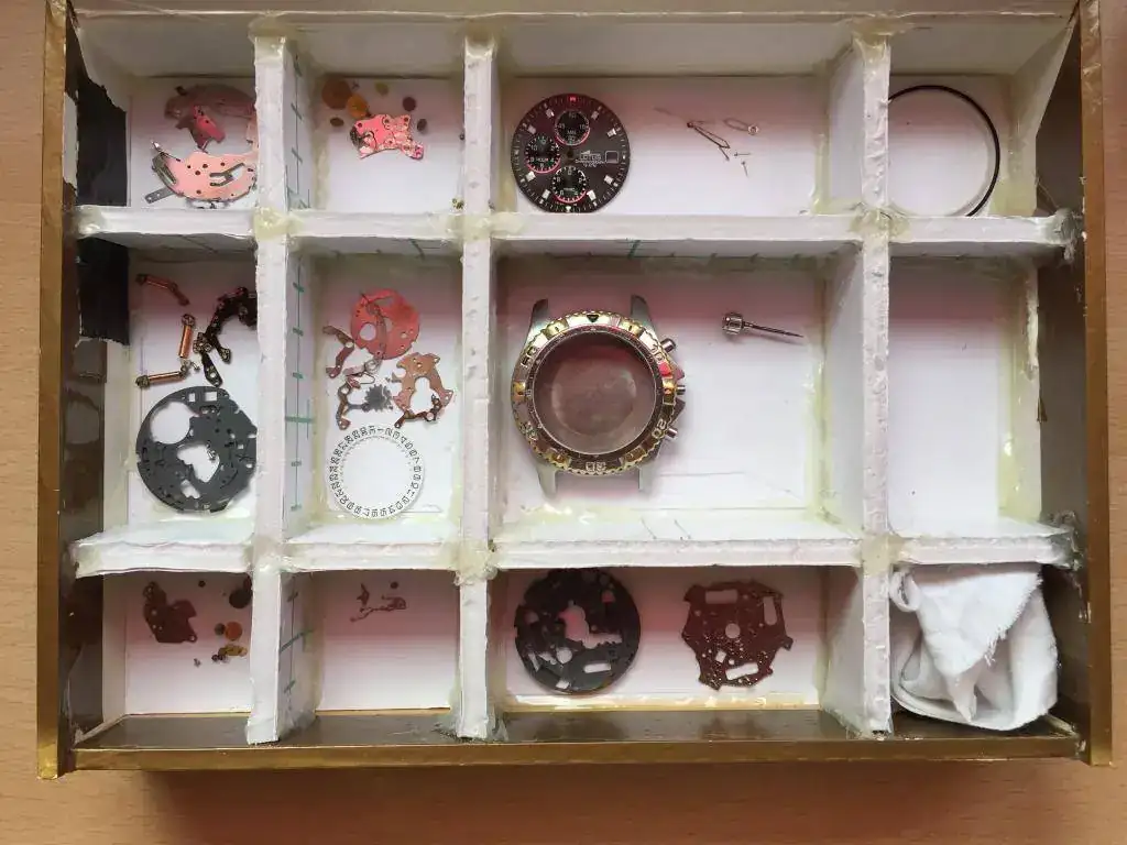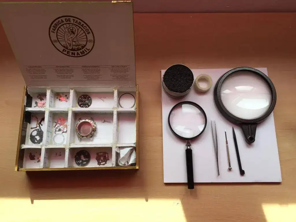 Hola a todos, hace 1 mes y medio que me he iniciado un poco en esto de la relojería y empezado a aprender como funciona un reloj, tanto mecánico como de pila. Tengo que decir que soy profeta del manifiesto de ifixit ( al final os lo pongo una foto del manifiesto ) , he estado estudiando los mecanismos miyota hasta que me ha quedado claro como funcionan y hoy llego el momento de ponerme a prueba. Tengo que decir que casi no tengo herramientas, he pedido unos estuches de pinzas y herramientas basicas para principiantes, pero todabía no me han llegado, asi que hoy he hecho algunas herramientas, me afile unas pinzas con limas a mano ( que por no poner guartes me pinche en el indice y entro como aguja hipodermica ), tambien afile un destornillador de los baratos hasta darle la medida, hice un palo afilado de plástico, reutilice una vieja caja de puros para ordenar las piezas, una base acolchada y una base para desmontar con el centro de un rollo de celo ( tesafilm ) y con unas lupas que tenía me he puesto a darle caña.