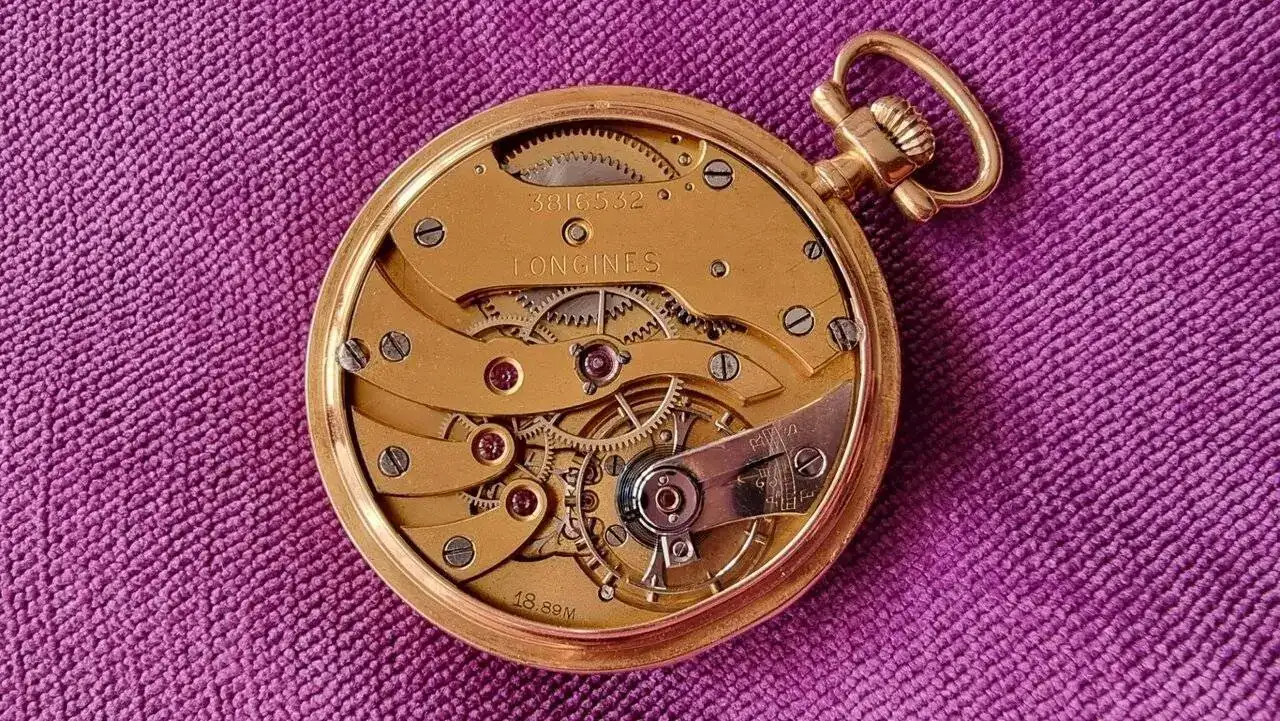 Resumiendo mucho: un buen amigo me ha dejado un antiguo Longines de bolsillo (por su nº de serie diría que de 1920 ó 1921) que no funciona y quiere que se lo arregle, el reloj en cuestión monta un movimiento Longines 18.89M (Mince/delgado) y el caso es que le falta todo el conjunto de volante/espiral y su puente (vamos, una faena no, lo siguiente) ; el resto del movimiento ya he constatado que está perfecto (salvo por algún resto de aceite/grasa secos que ya he limpiado y restaurando la lubricación completa de todo) una foto del estado en el que me he encontrado el reloj al abrirlo: