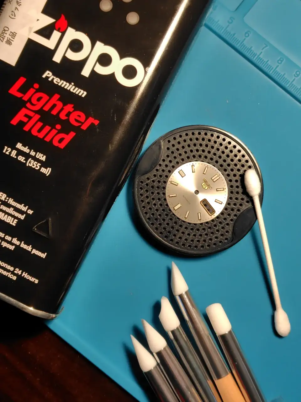 Para limpiar diales, lo mejor es impregnar muy poco un bastoncillo con gasolina tipo zippo, y rodar suavemente sobre el dial, NUNCA frotar. Y, por supuesto, JAMÁS usar isopropílico! La clave es rodar el bastoncillo. Luego uso estos pinceles de silicona especiales para esto.