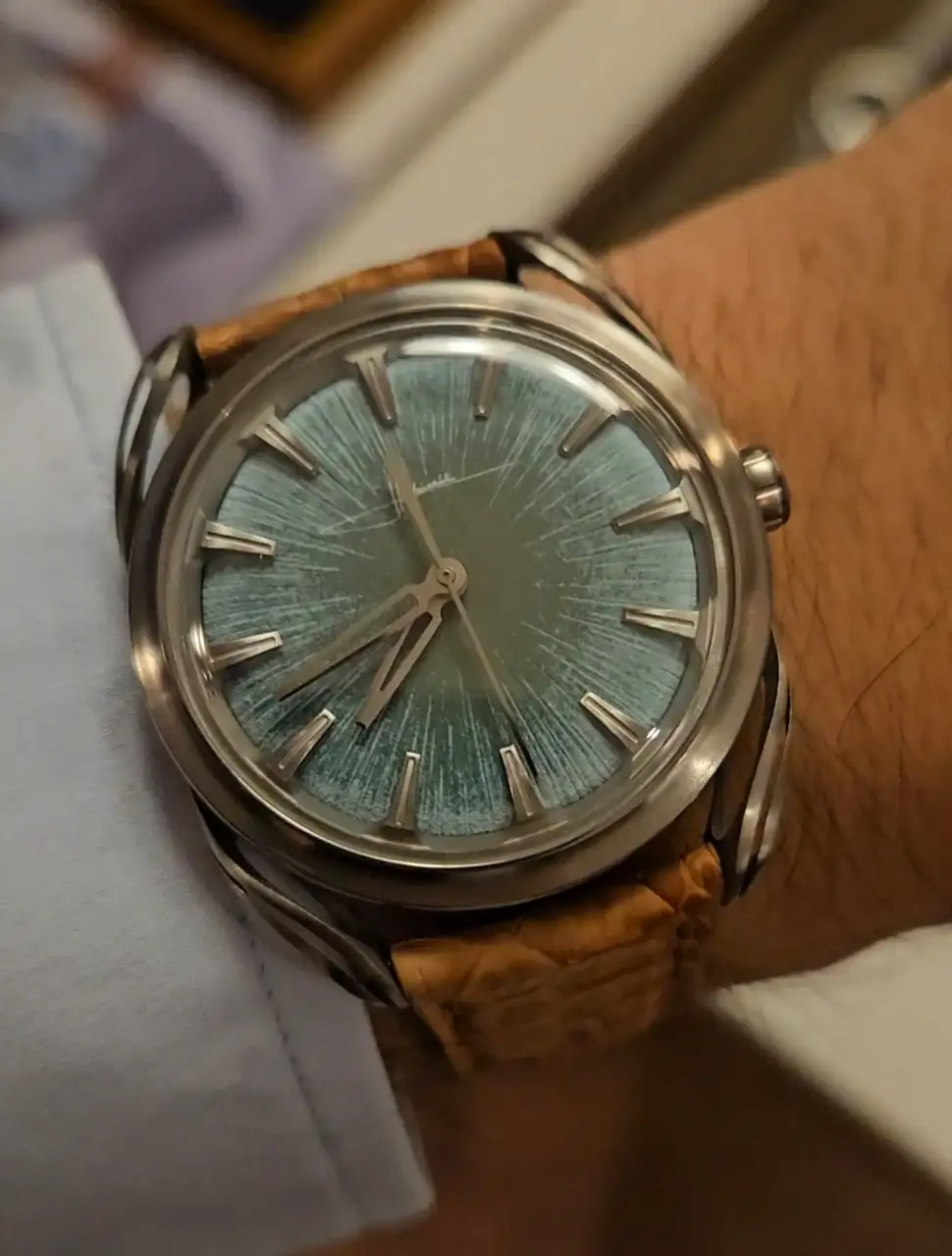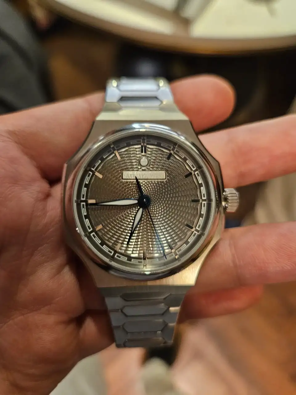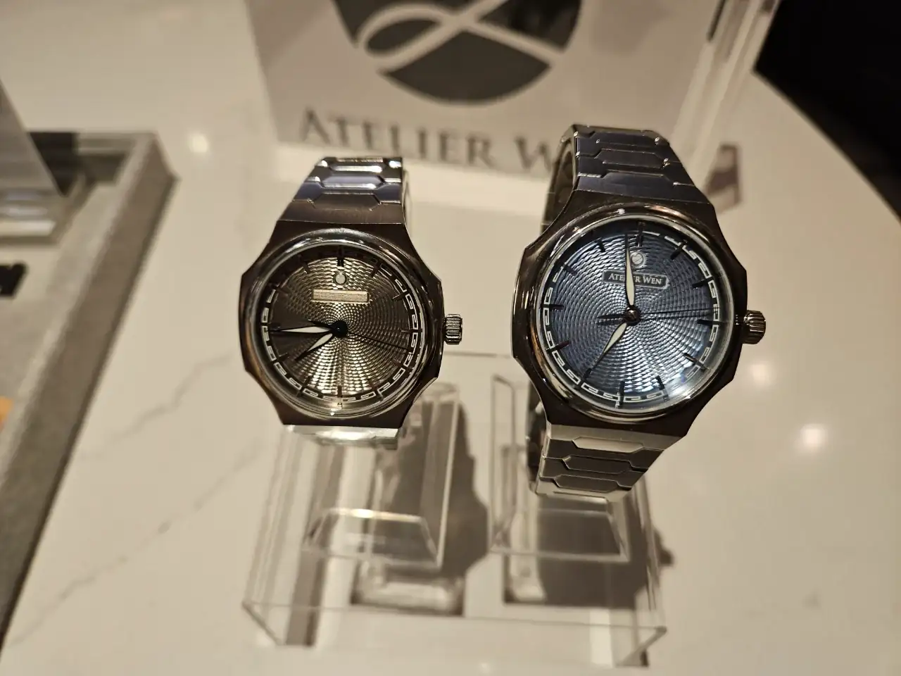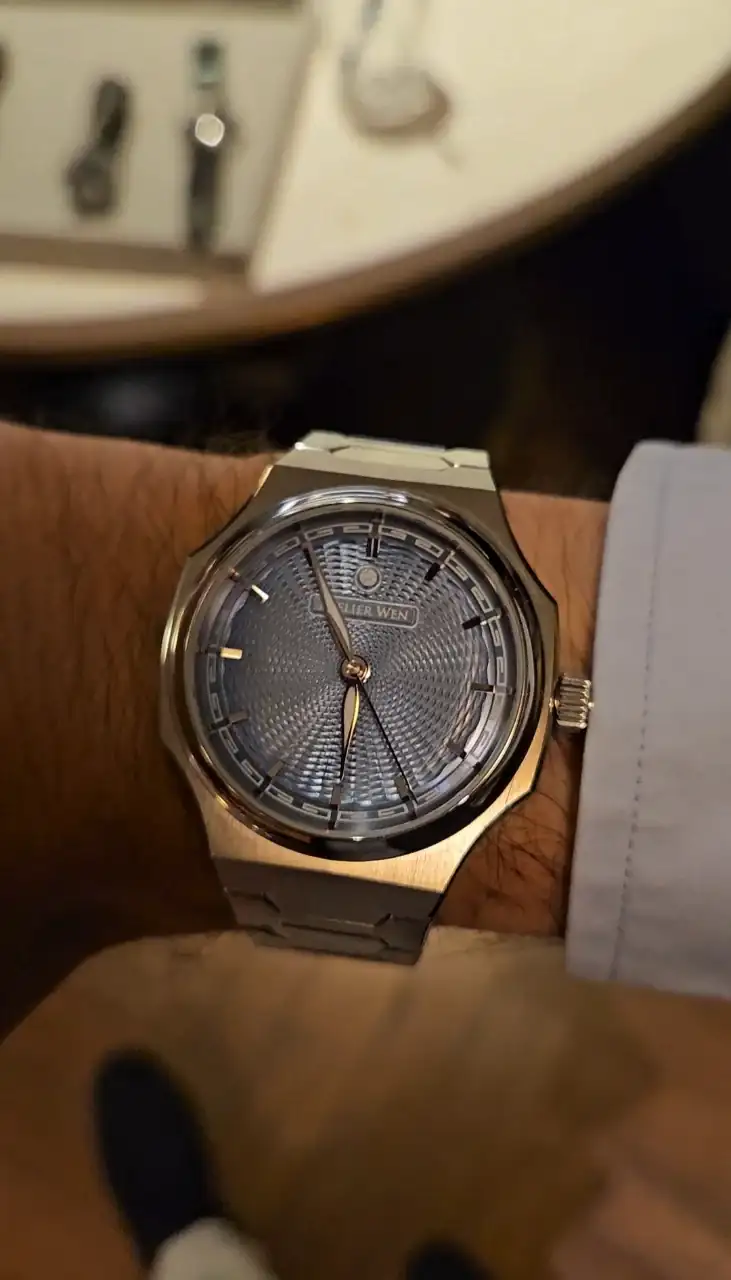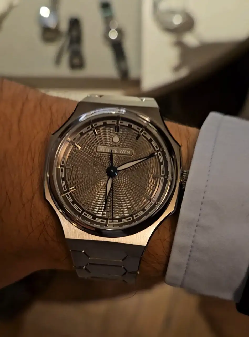 Os cuento un poco del reloj... La esfera es guilloché, pero hecho "a mano", no está hecho con CNC, y tiene una pinta espectacular al mover en reloj y jugar con las luces. Lo otro a destacar es el brazalete. Los eslabones encajan unos con otros de manera perfecta, pero además, tiene un micro ajuste con un botón camuflado en el logo del cierre. Conseguí que me quedase como un guante uno de los dos que tenían expuestos. Son 3000 euros de reloj, pero la impresión que me dio fue de un valor muy superior, ultra lujoso y comodísimo. Decir por último que el calibre es un Peacock decorado y mejorado para Atelier Wen. La marca es china pero de propiedad occidental. Os dejo unas fotos de como me quedaba