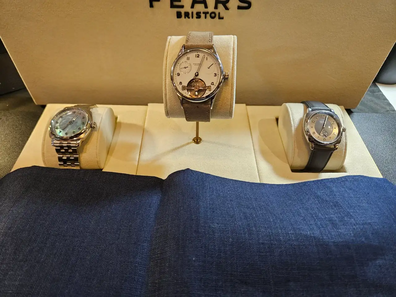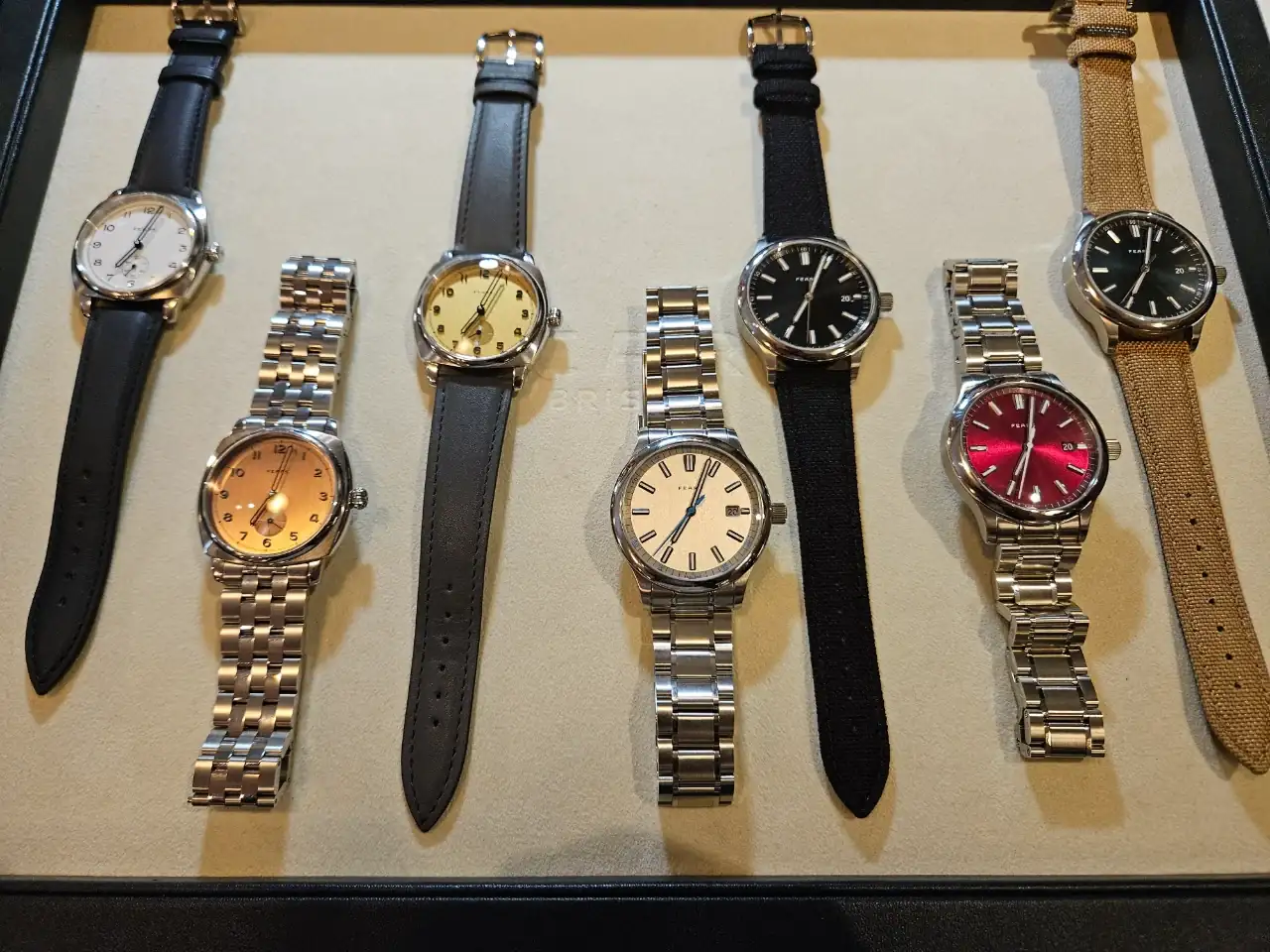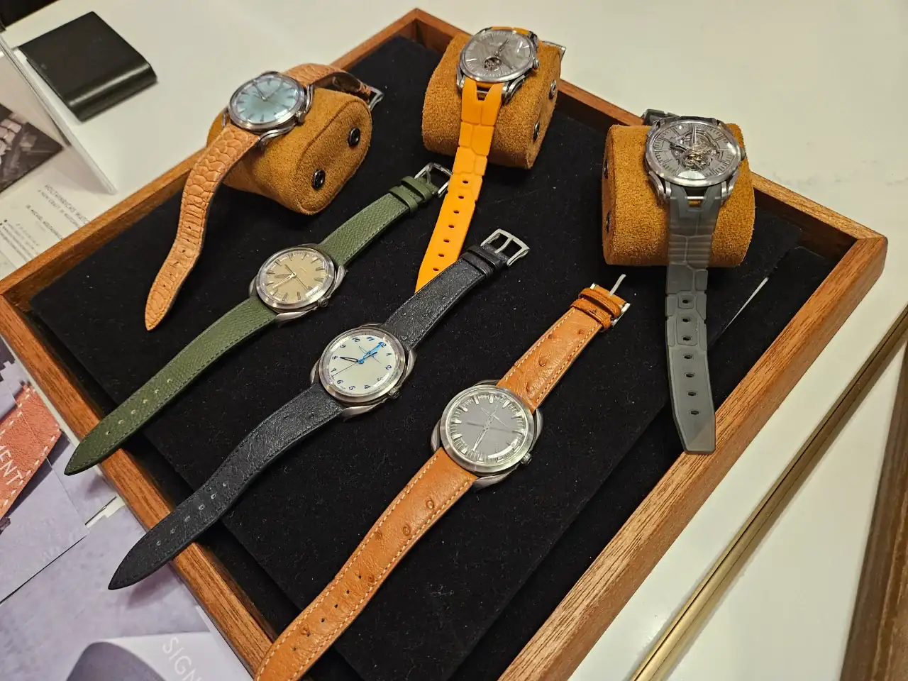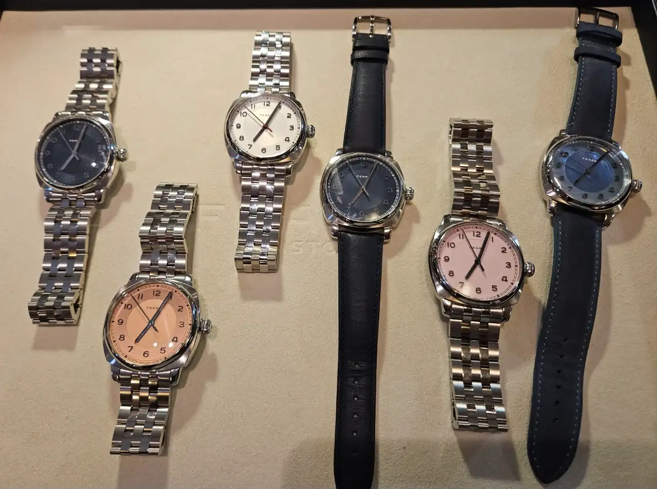 Tienen relojes verdaderamente bonitos y se nota que es una calidad superior a la estándar. Veis que en una de las fotos hay un trapo, es porque debajo estaba en exclusiva el nuevo modelo que van a sacar. Levantaban el trapo y te lo enseñaban pero no se podía sacar fotos. Fuimos los primeros fuera de Fears en ver ese reloj 😆. Ay, las tácticas de marketing de las empresas... además nos dieron un QR, que permite acceder a la pre compra del reloj. Voy a dar solo una pista, el nuevo modelo tiene un color muy de moda, y una complicación guapísima, muy minimal.