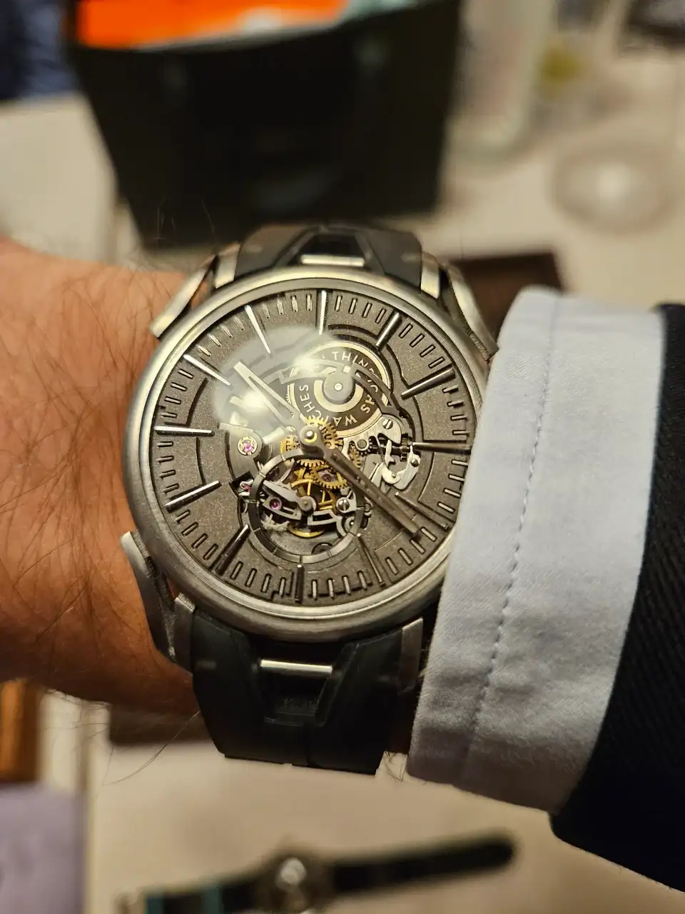 Esta marca la particularidad que tiene es que la caja y la esfera están hechas a mano por el propio Richard, en Wimbeldon. La forma de la caja es tremendamente atípica, pero he de decir que puesto en muñeca (en la de otro, porque en la mía no, no es un reloj para muñecas pequeñas) se ve muy chulo. La esfera crea además unos reflejos muy atractivos. Los vi antes del evento porque al almuerzo pre evento vinieron Richard y su hijo, y cuando me fije en sus relojes, me sorprendieron de verdad. Yo ya los había visto en fotos, y es que ganan muchísimo en persona.