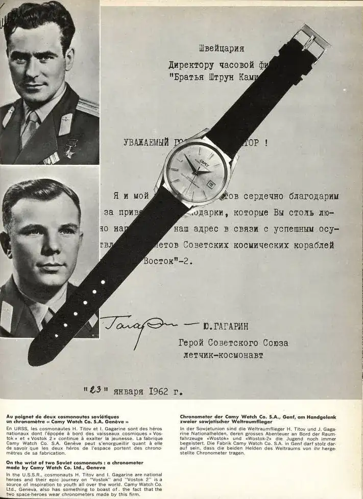 Para terminar este párvulo repaso histórico de la firma, puede que el dato más curioso e interesante de Camy sea que en 1964 suministró a los cosmonautas soviéticos Yuri Gagarin y Gherman Titov relojes de precisión que se presentaron como cronómetros (aunque la firma no obtuvo ningún certificado oficial en su momento). Esto era parte de las estrategias específicas que los relojeros suizos desarrollaron para dar a conocer sus marcas en la URSS. La cooperación con los cosmonautas soviéticos fue una primera oportunidad para establecerse en este mercado tan hermético y altamente protegido.