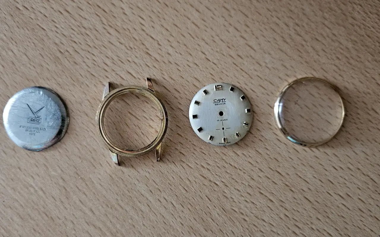 Entonces, quedaba claro que tendría que usar el movimiento, la caja, la tapa/fondo, la corona y las manecillas del reloj donante y aprovechar el bisel original junto con la esfera original, además de buscar un plexi nuevo acupulado y de 27mm de diámetro.