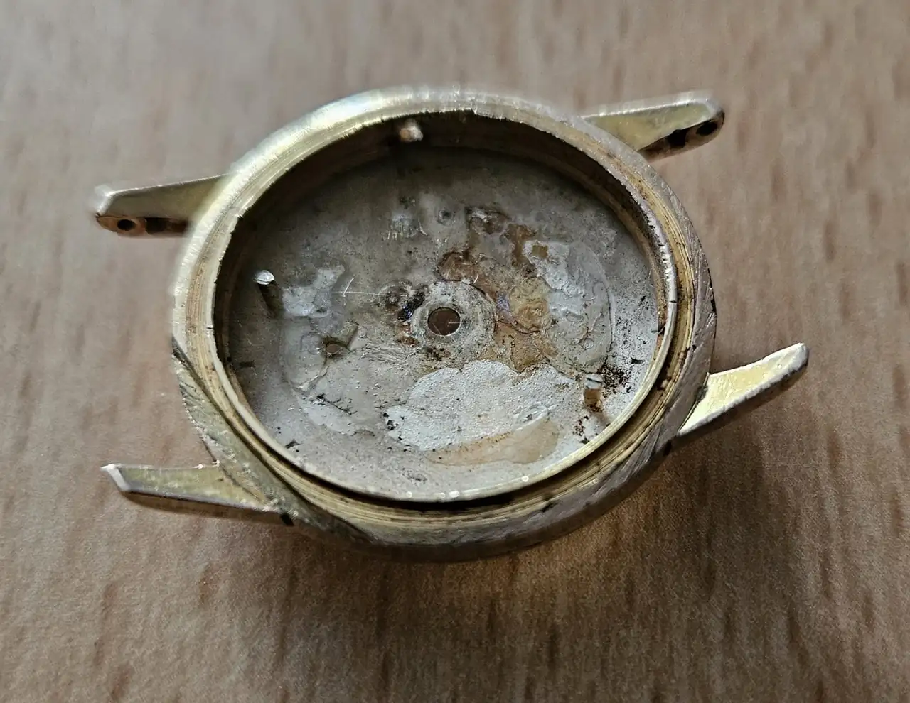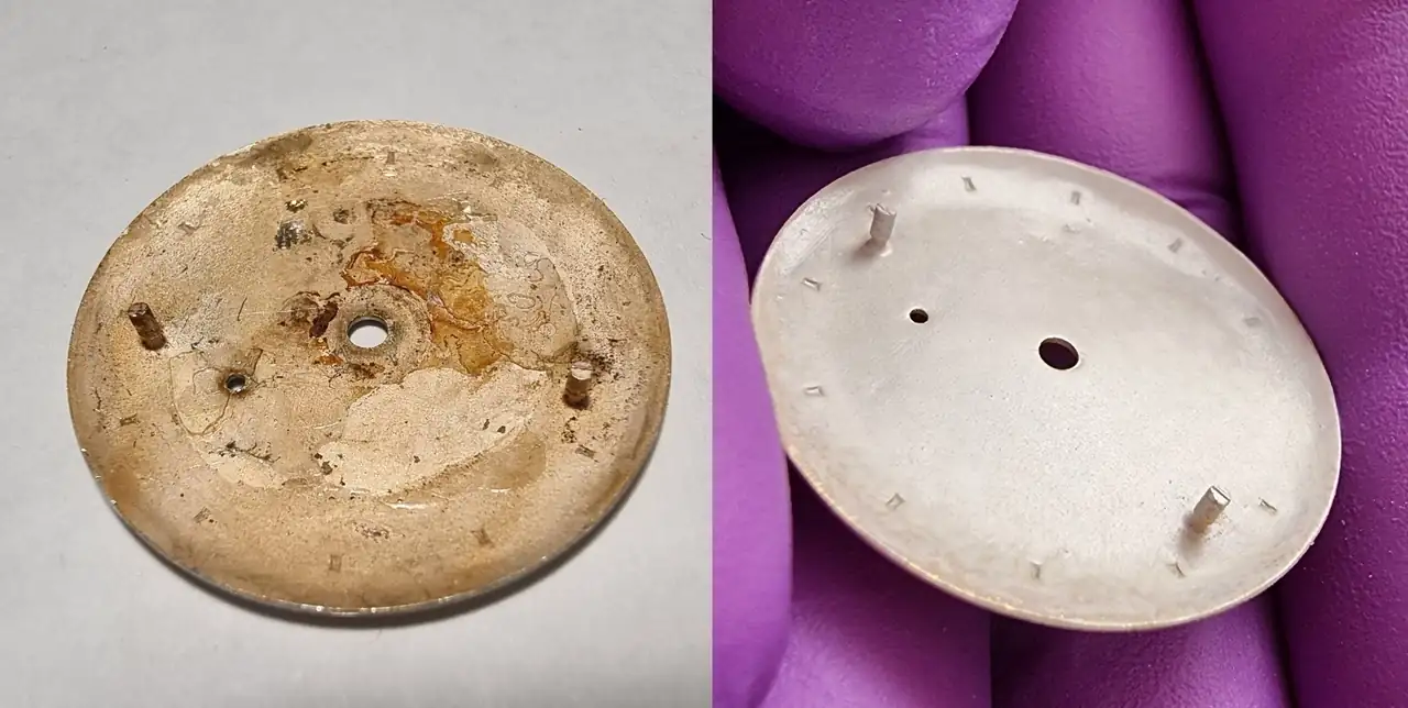 La (muy) buena noticia es que el dial, pese a su visible deterioro general en su anverso, mantenía sus patas/pivotes de anclaje al movimiento. En esta foto compartida por él se aprecian tanto las patas de la esfera como también la corrosión que afectaba el reverso de la misma y los daños en la trasera de la caja: