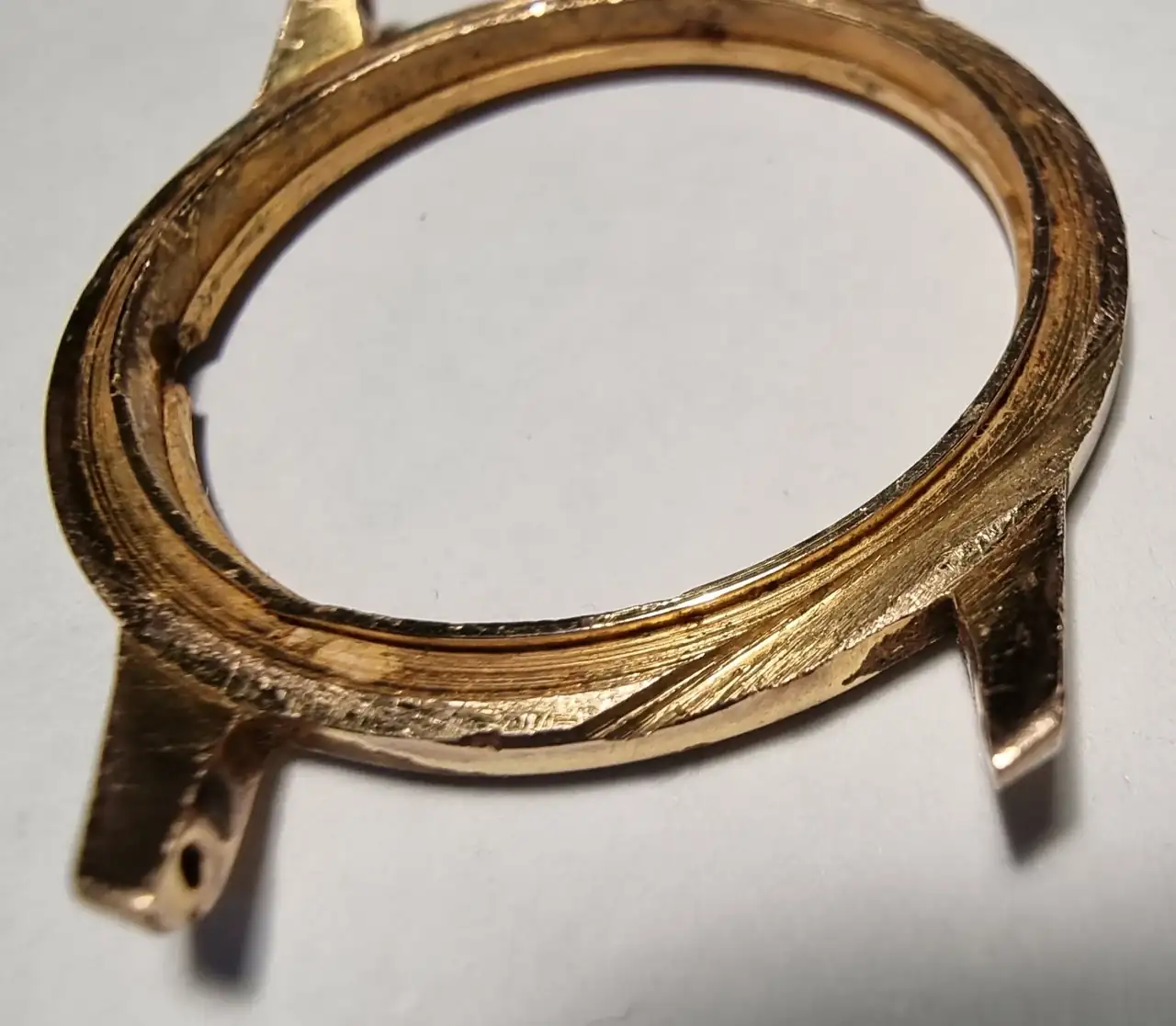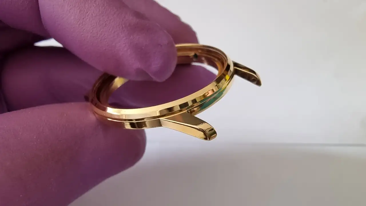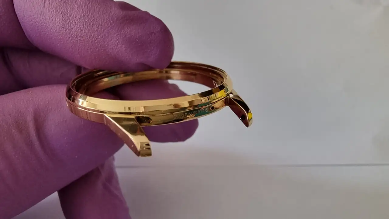 Resultado de la caja donante, bisel original y corona tras los procesos de limpieza, desbastado fino, pulido, desengrasado y chapado de oro: