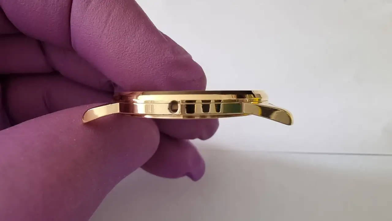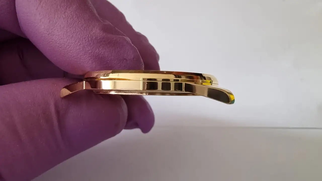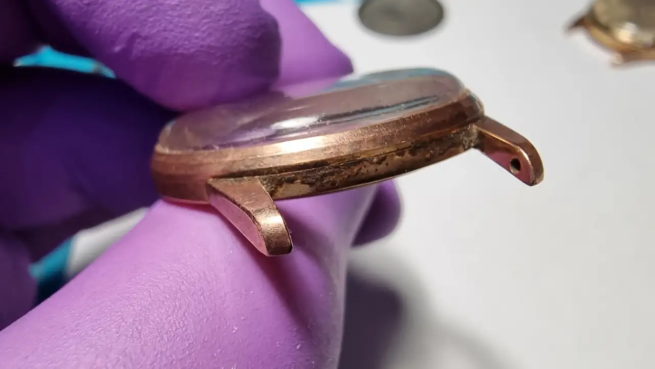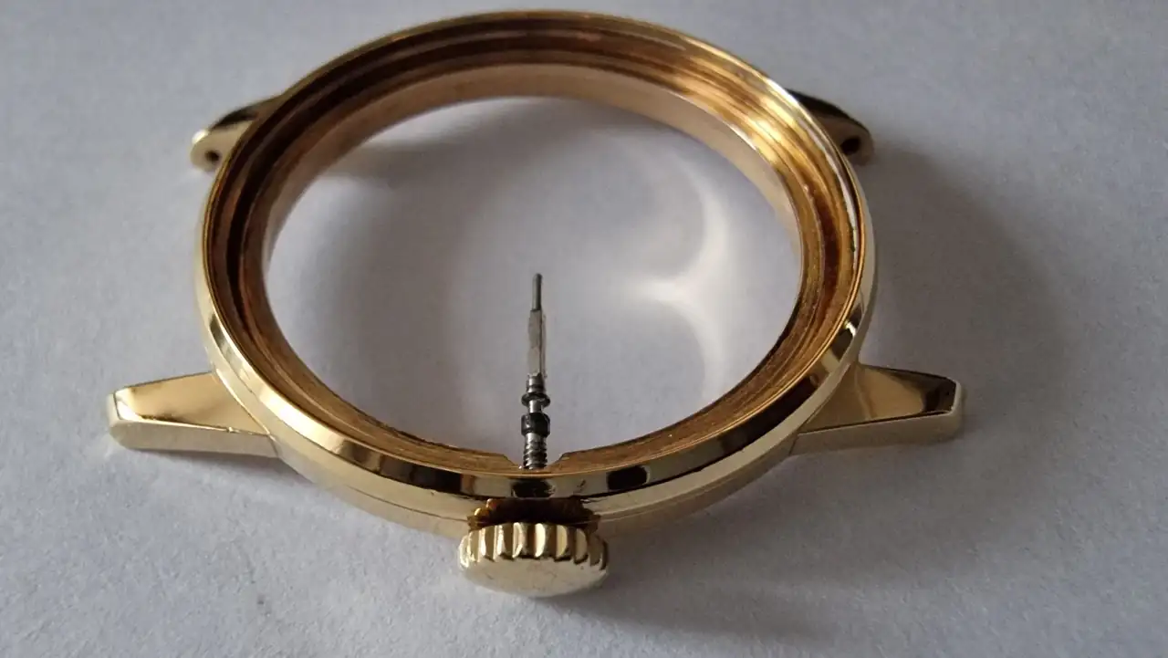 Resultado de la caja donante, bisel original y corona tras los procesos de limpieza, desbastado fino, pulido, desengrasado y chapado de oro: