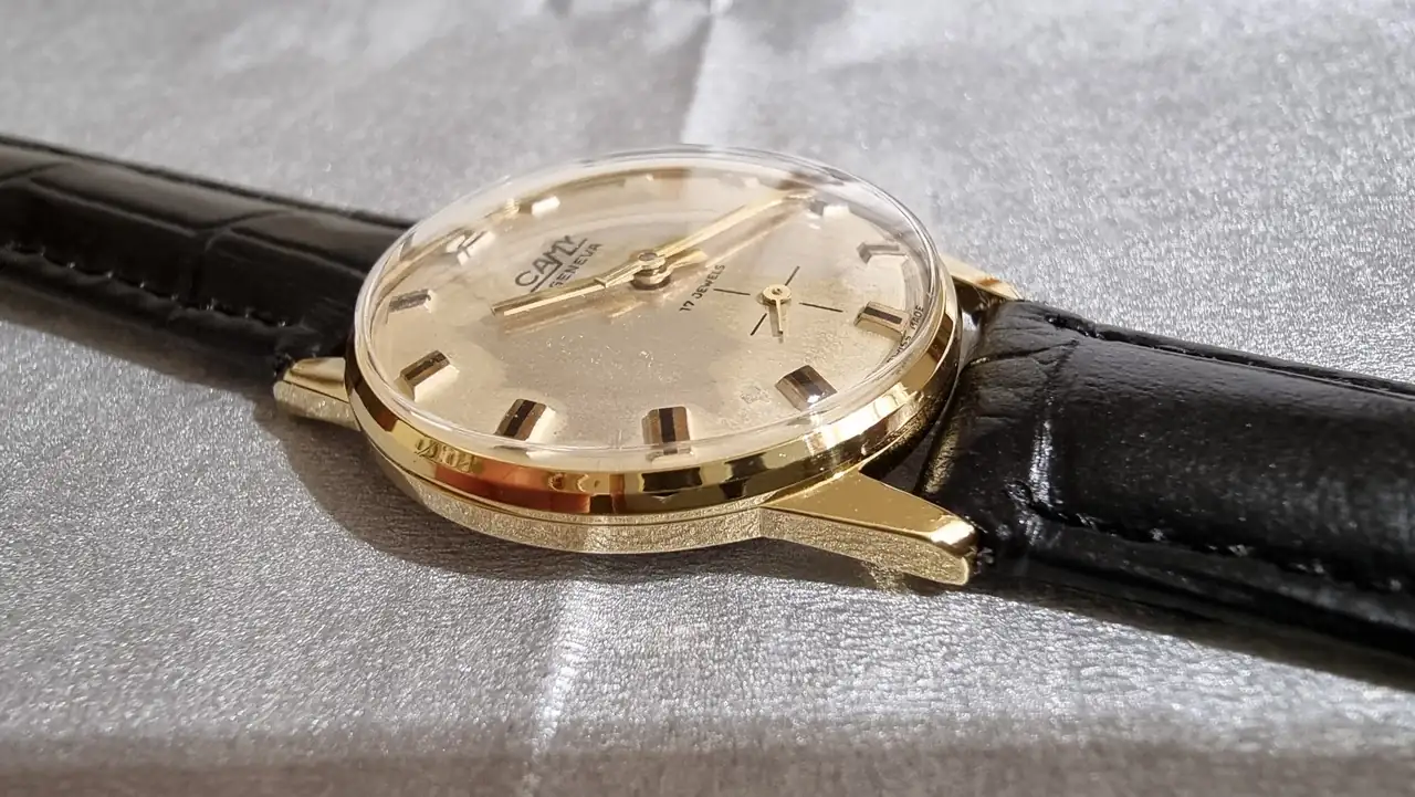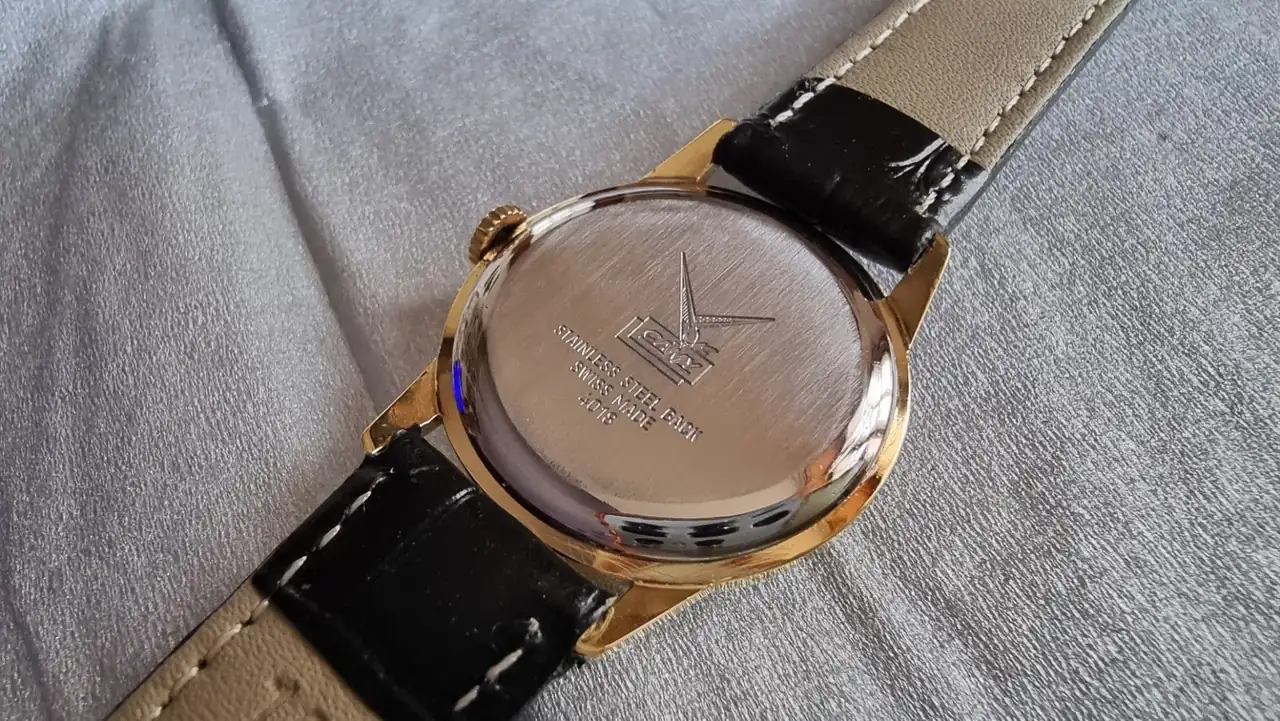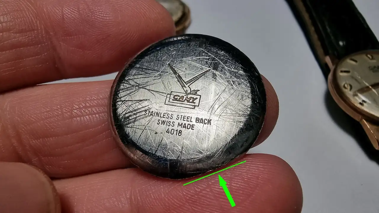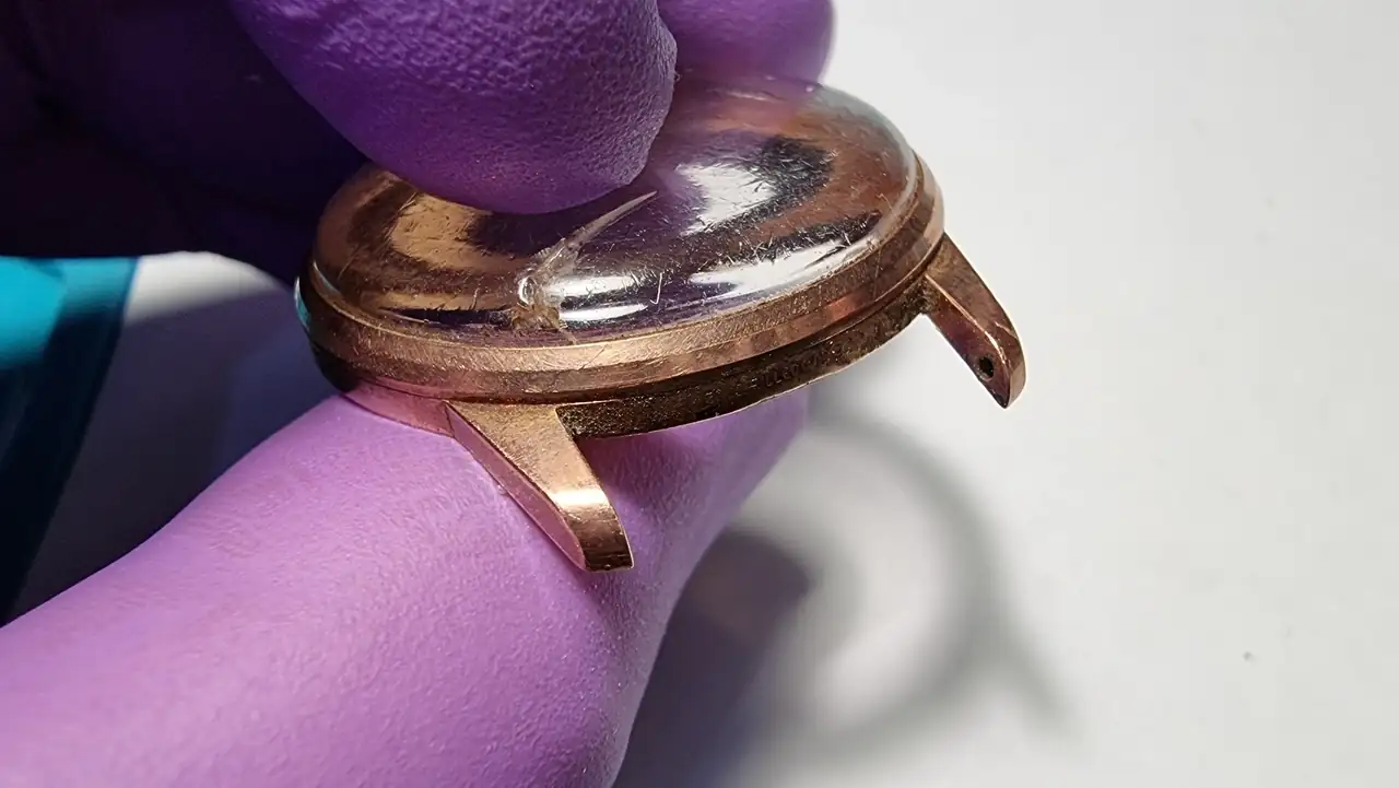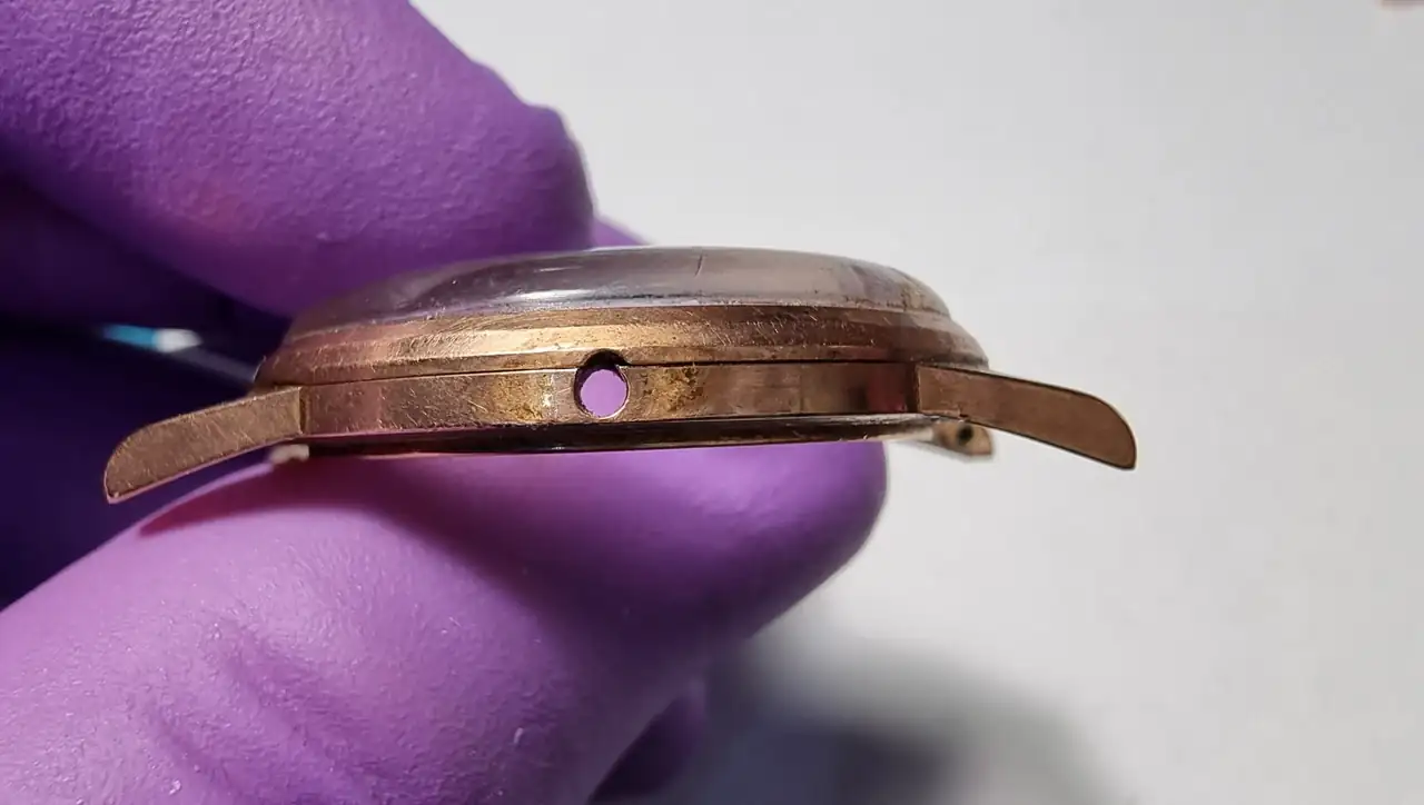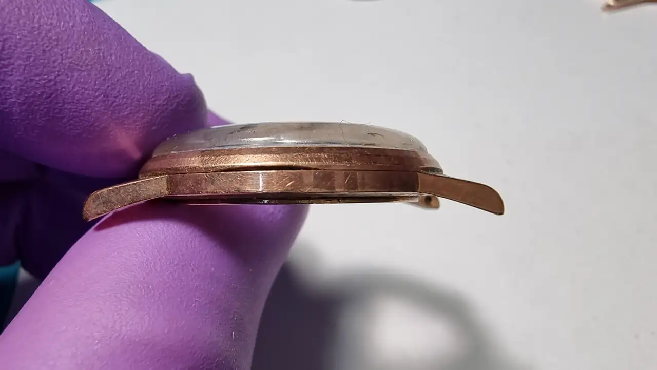 El bisel original mantenía algo mejor el brillo de su baño de oro, pero la caja, bisel y corona del donante mostraban una pátina que ya había opacado por completo el lustre original que en algún momento el chapado en oro de fábrica, de 10 micras, tuvo. Dicha opacación probablemente fue debida al contenido de cobre en el oro expuesto en un ambiente de alta humedad por un prolongado periodo de tiempo. La caja también presentaba algo de suciedad entre asas.