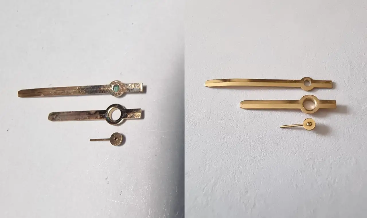 La fotografía de la izquierda muestra el estado de las manecillas tras ser extraídas del movimiento, la de la derecha muestra el resultado de las manecillas tras la limpieza, desbastado, pulido, desengrasado y el nuevo chapado, esta vez en oro amarillo de 24K: