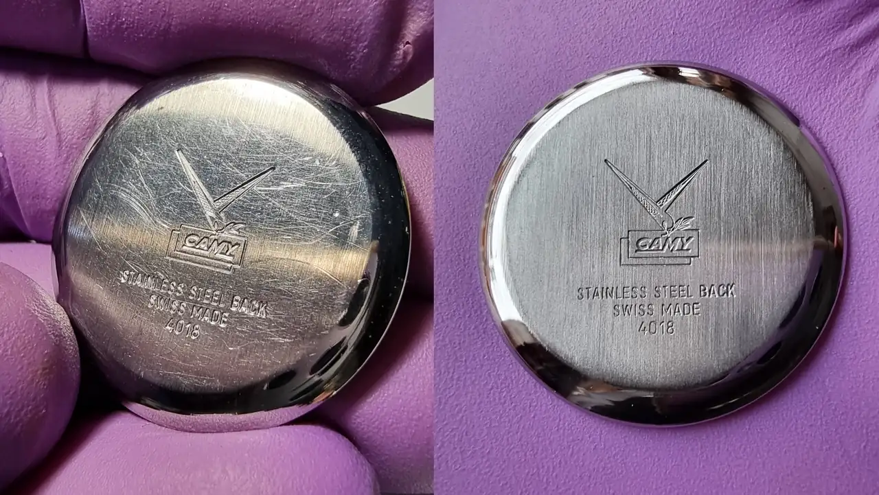 La tapa del donante tenía el cepillado y el pulido un poco rayados superficialmente y algo de suciedad incrustada en los surcos de logos, leyendas y números troquelados, pero estaba en buen estado. Con una limpieza por ultrasonidos para extraer la suciedad de los surcos del metal, un pulido del perímetro curvo externo y rehacerle el cepillado de su parte central plana, quedó muy bien. La imagen de la izquierda muestra la tapa ya sin suciedad en los surcos, con un pulido perimetral previo pero todavía con los rayones que tenía el cepillado; la de la derecha ya muestra la tapa totalmente saneada: